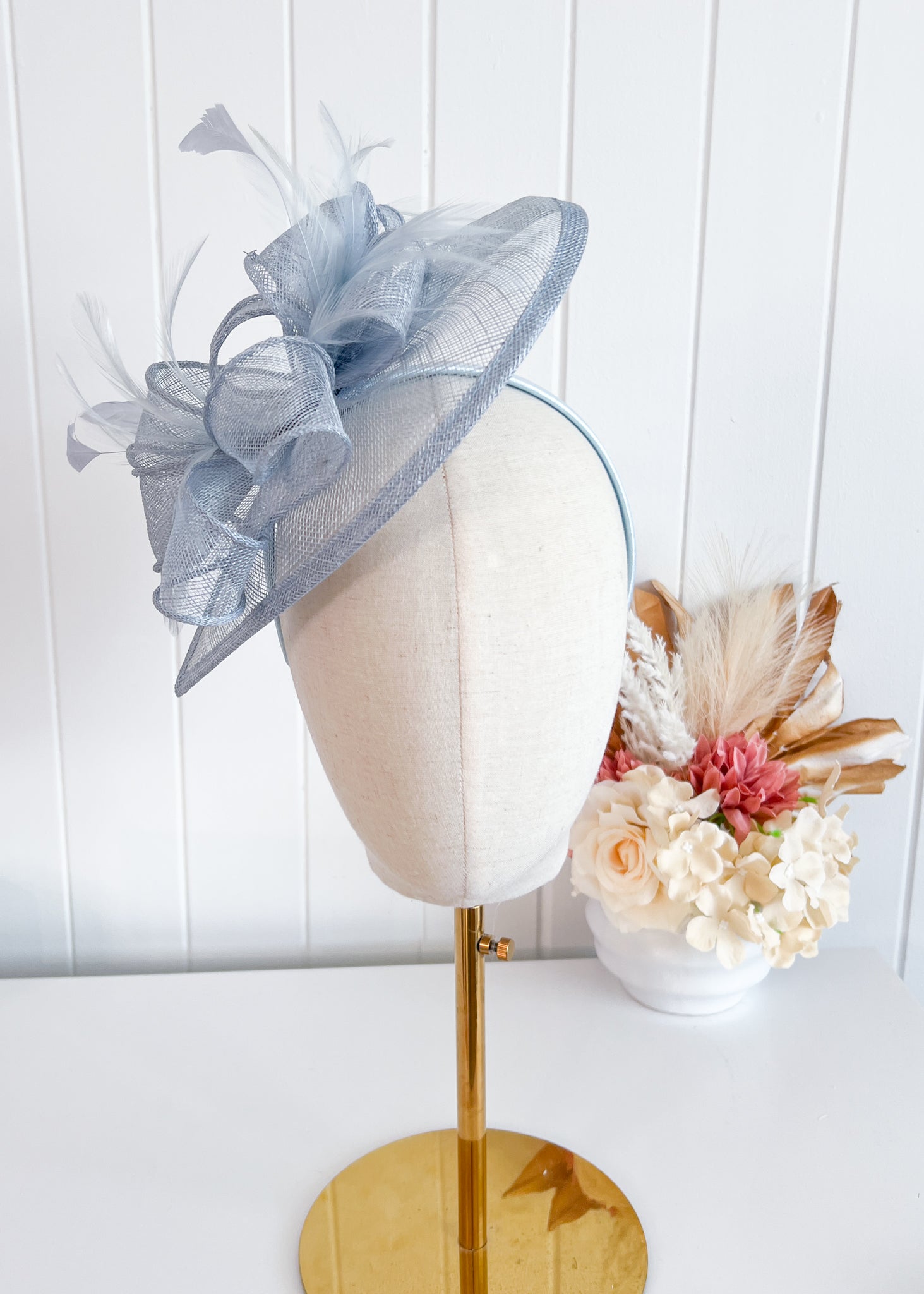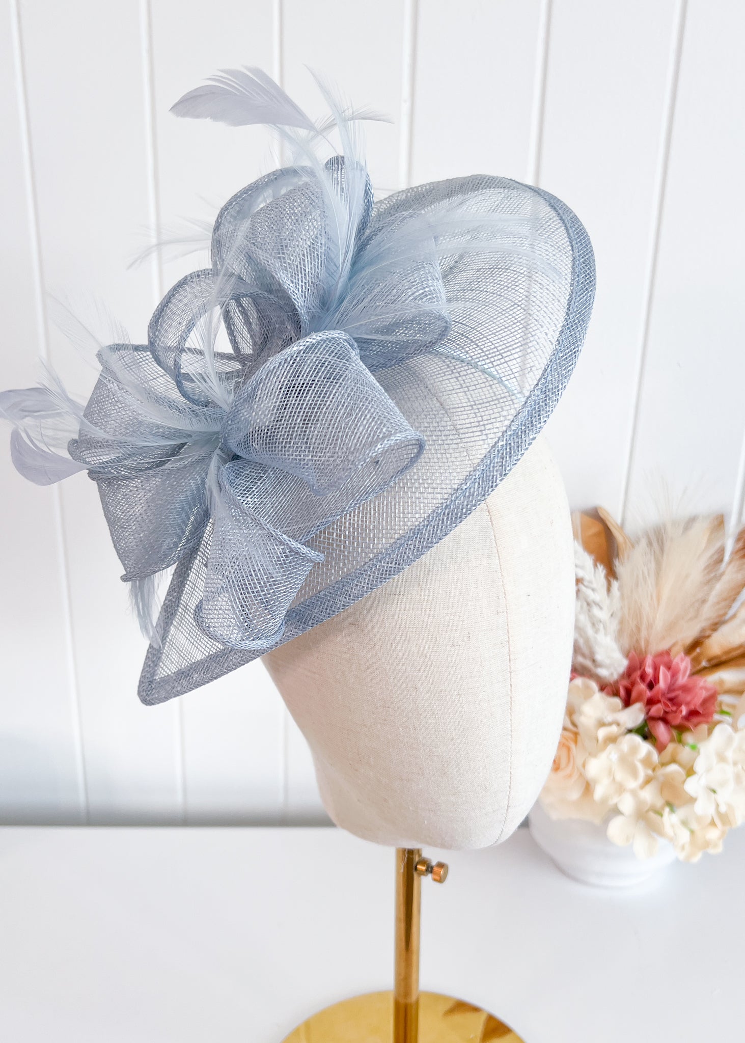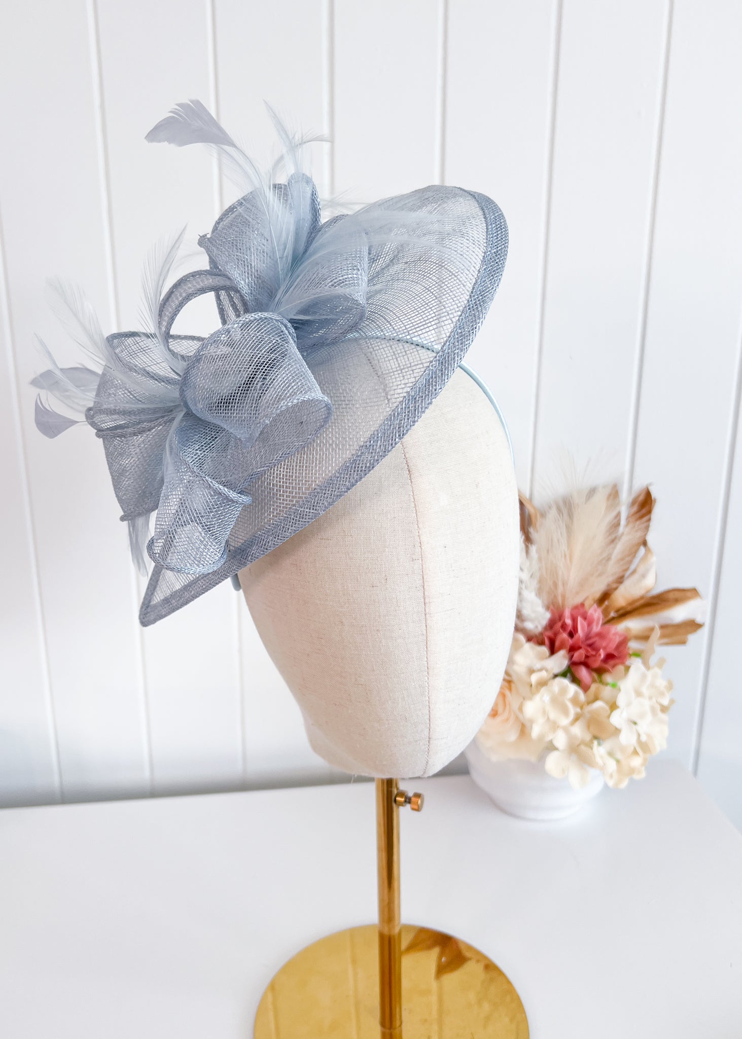 This elegant design features a sinamay base which sits attractively over right side of the head. Soft feathers at the front and back add texture.