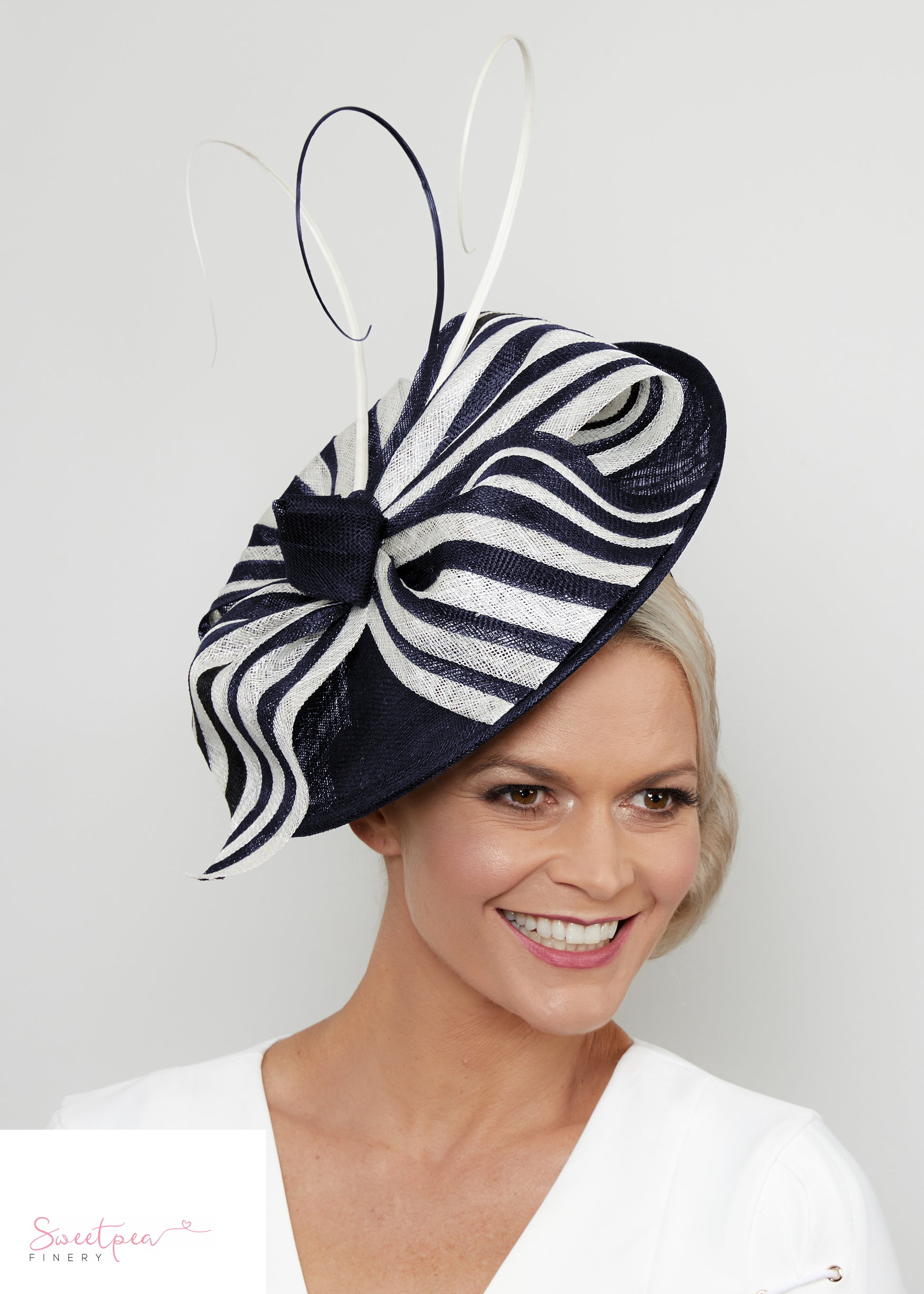 Features beautifully crafted striped sinamay bow, on a large saucer base, with ostrich feather quills for additional height and drama.