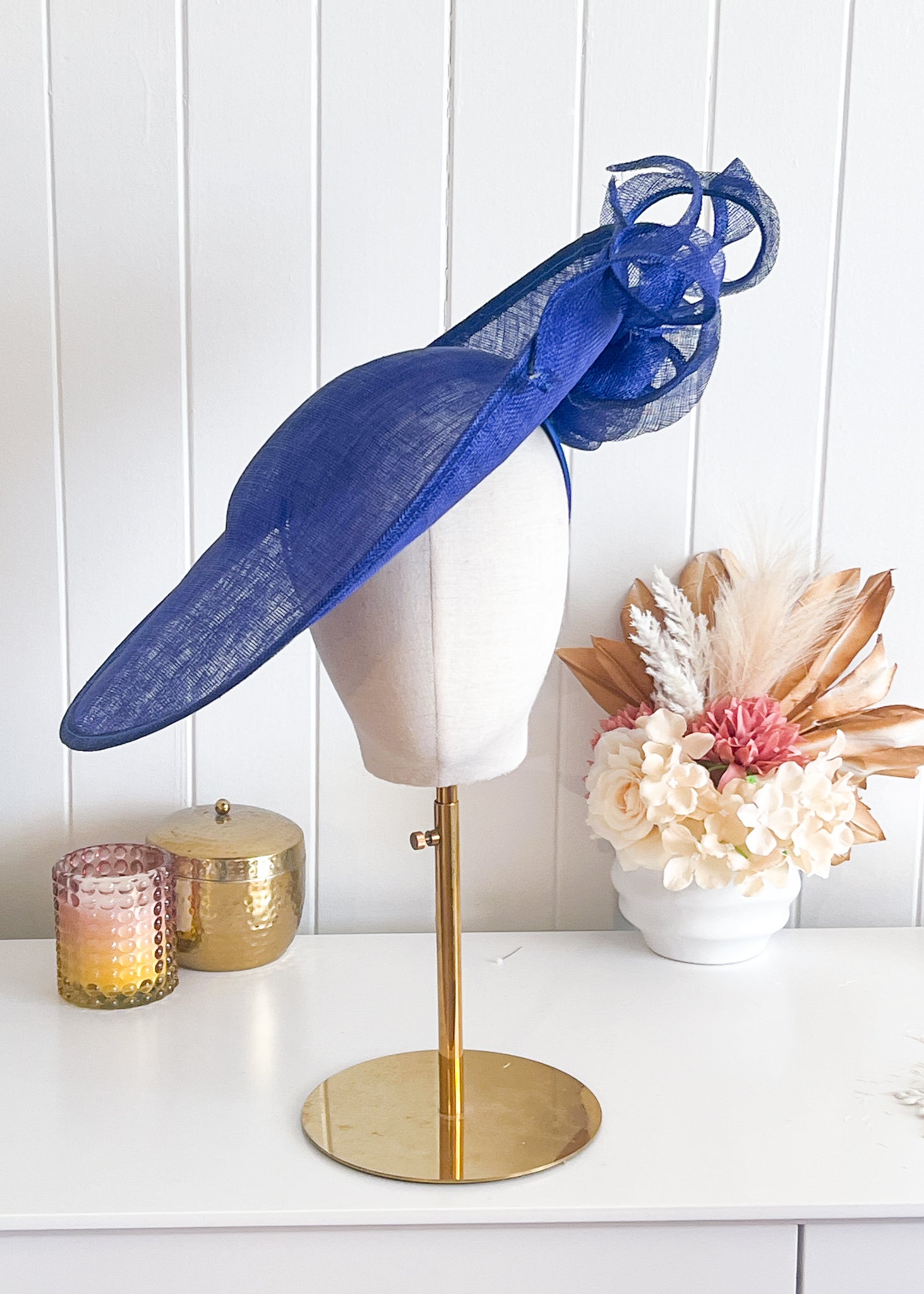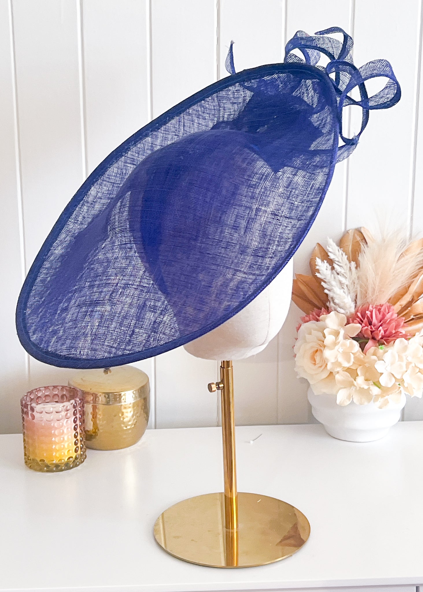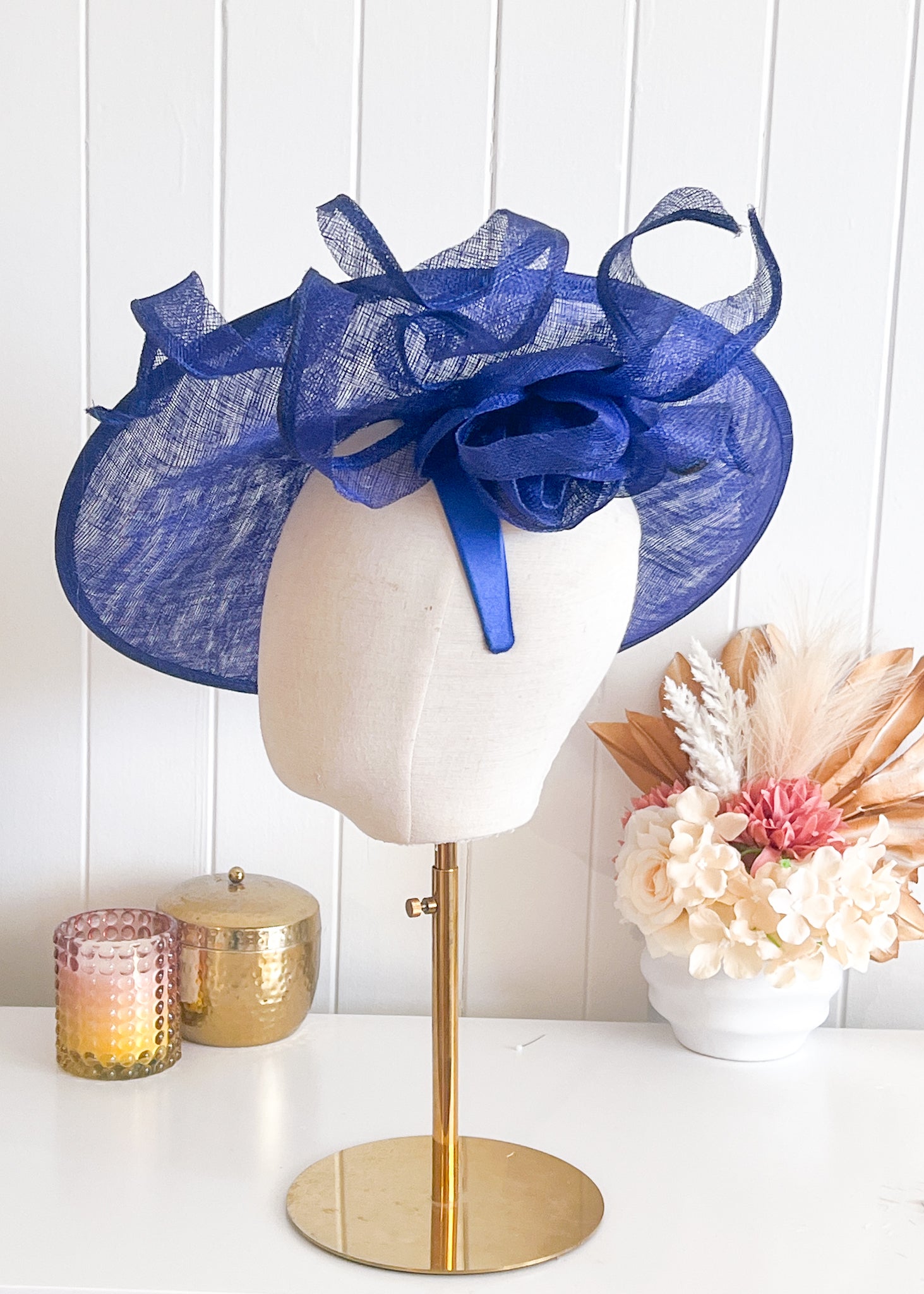 This headpiece features a large sloping sinamay brim, which tilts attractively to one side. Handmade wired sinamay curls under the brim can be positioned as desired.