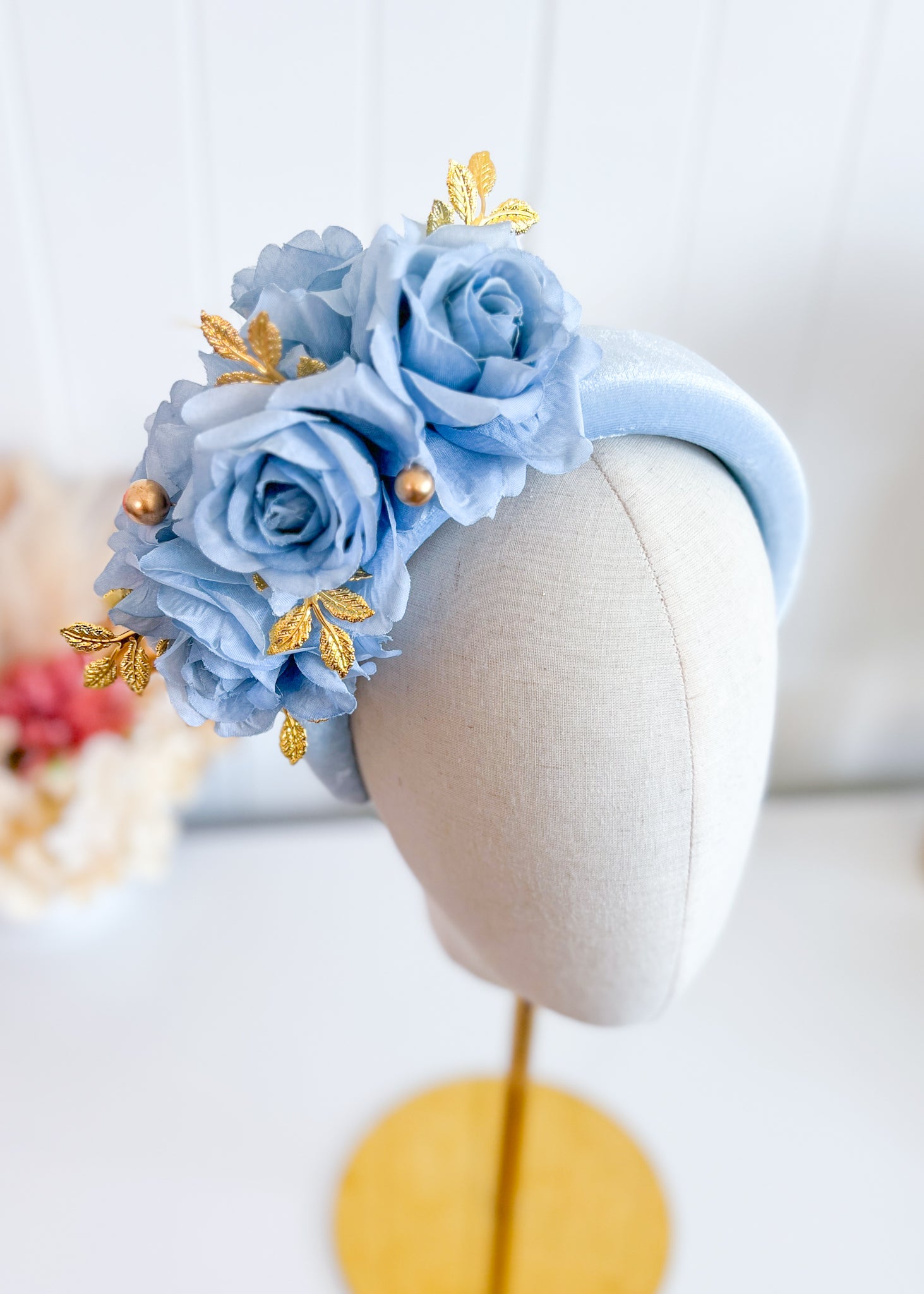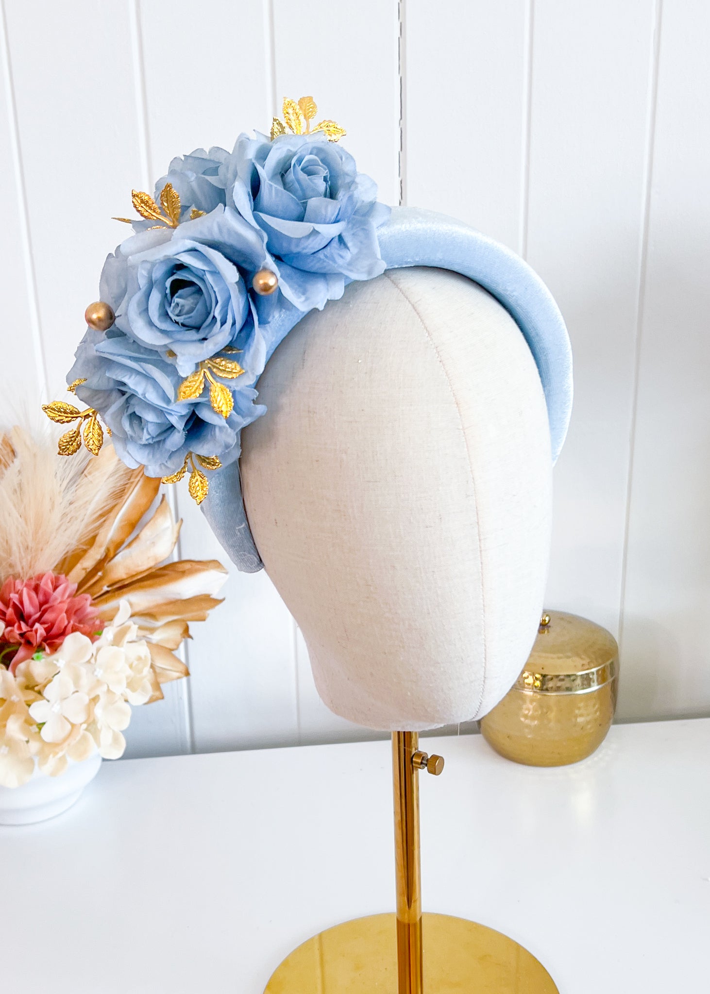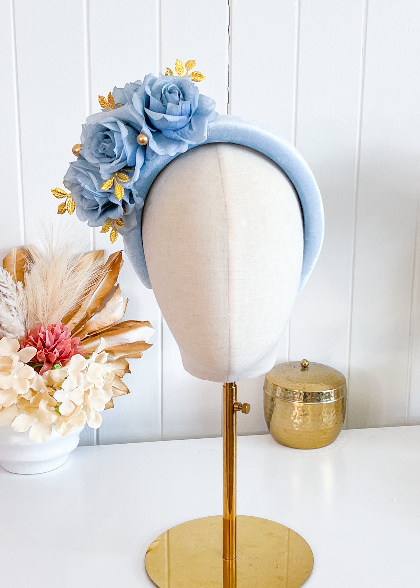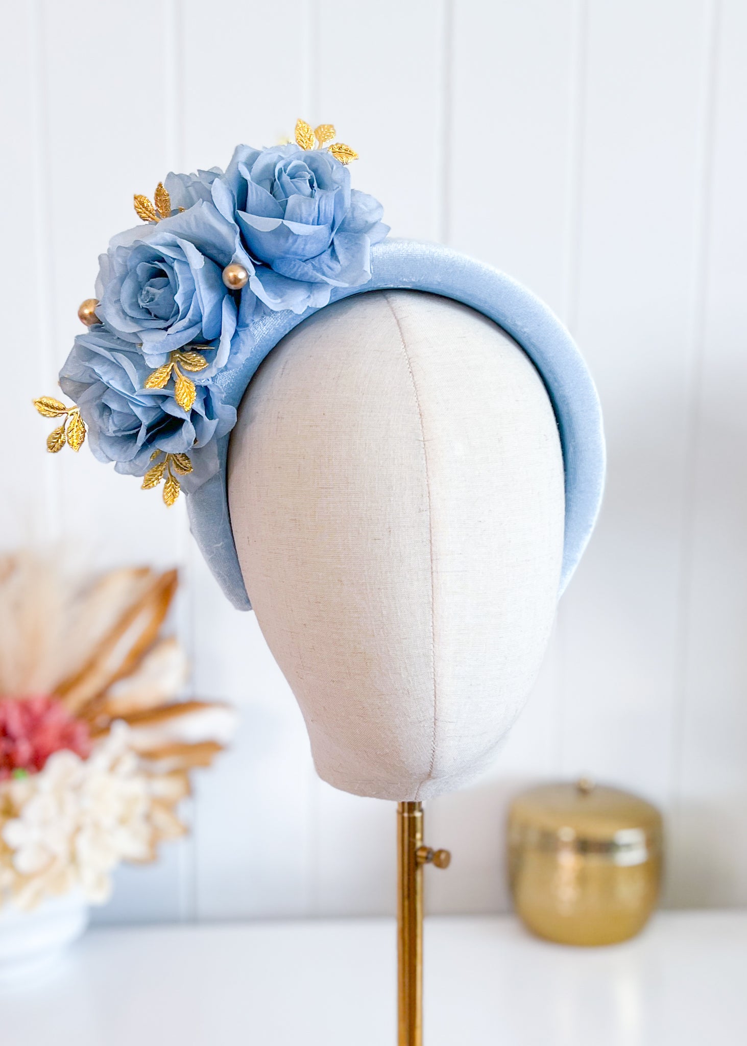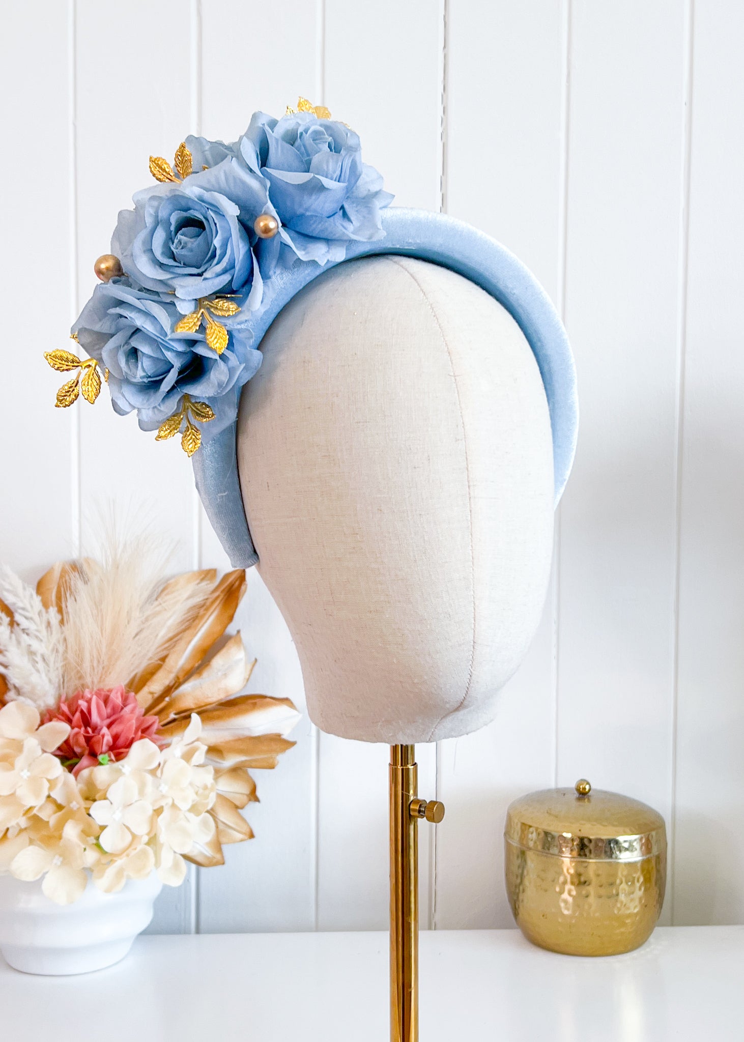 Featuring a padded headband, with real touch silk flowers, and decorated with gold accents.