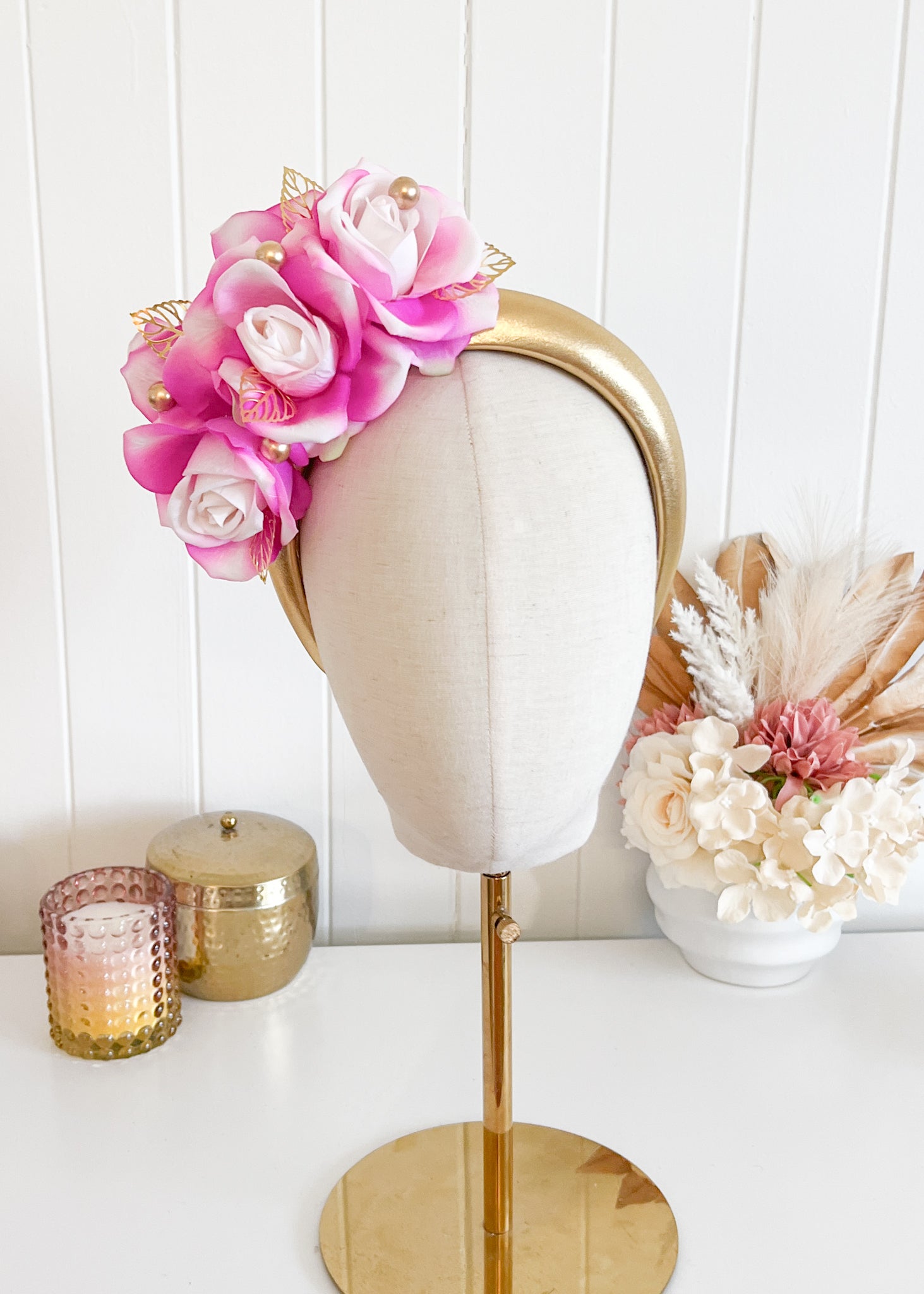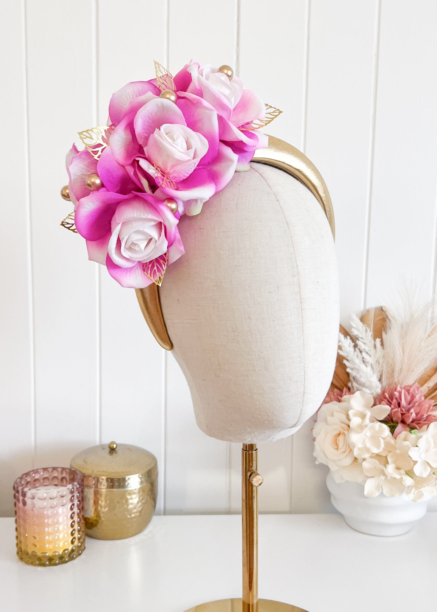 Featuring a padded headband, with real touch silk flowers, and decorated with gold accents.
