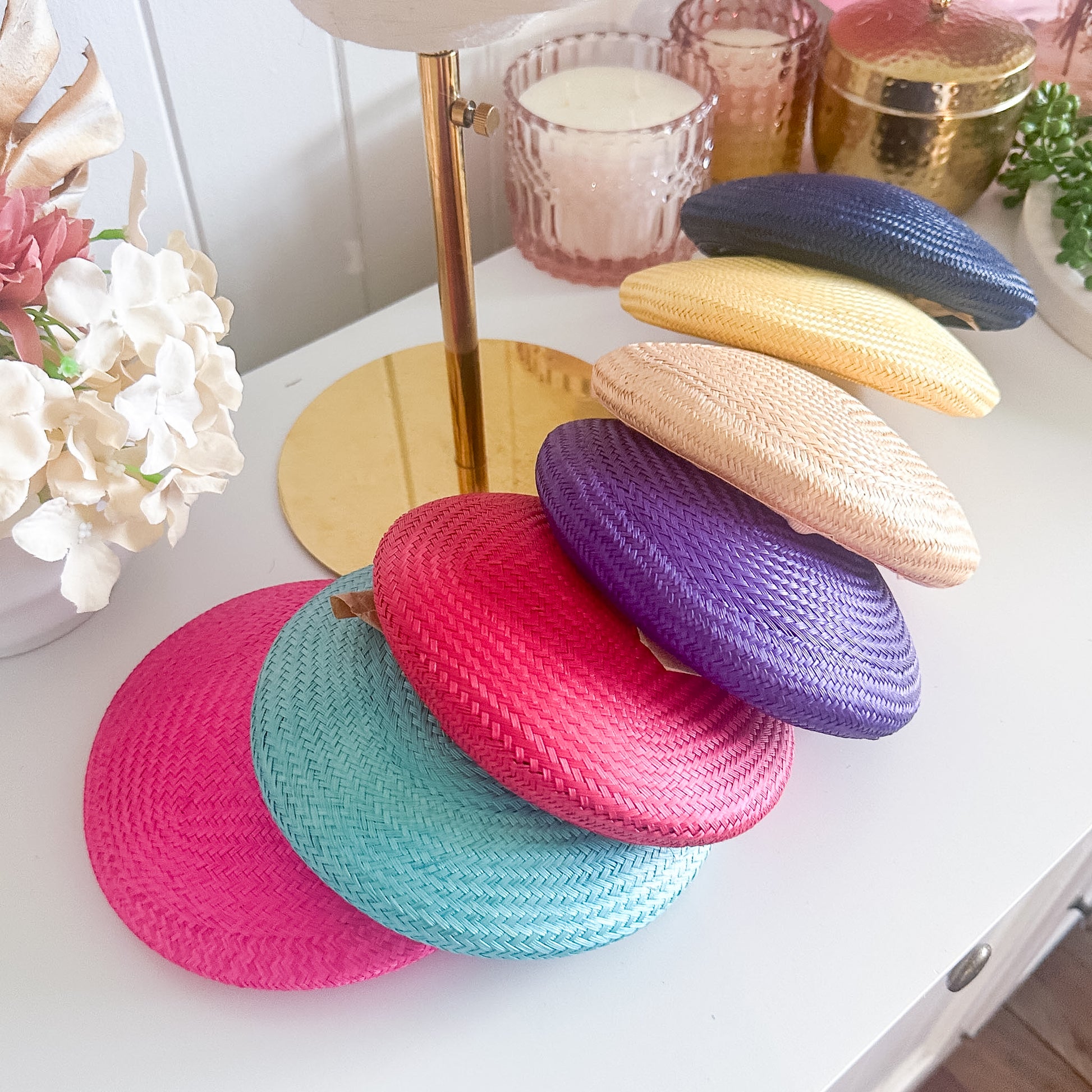 Buntal straw hat that has been blocked into a circle button shape. This hat can be worn on its on or it can be trimmed and decorated with veiling, feathers etc to make it your own unique hat. The hat shape measures approximately 16cm long x 2cm high. Sold per 1 piece.
