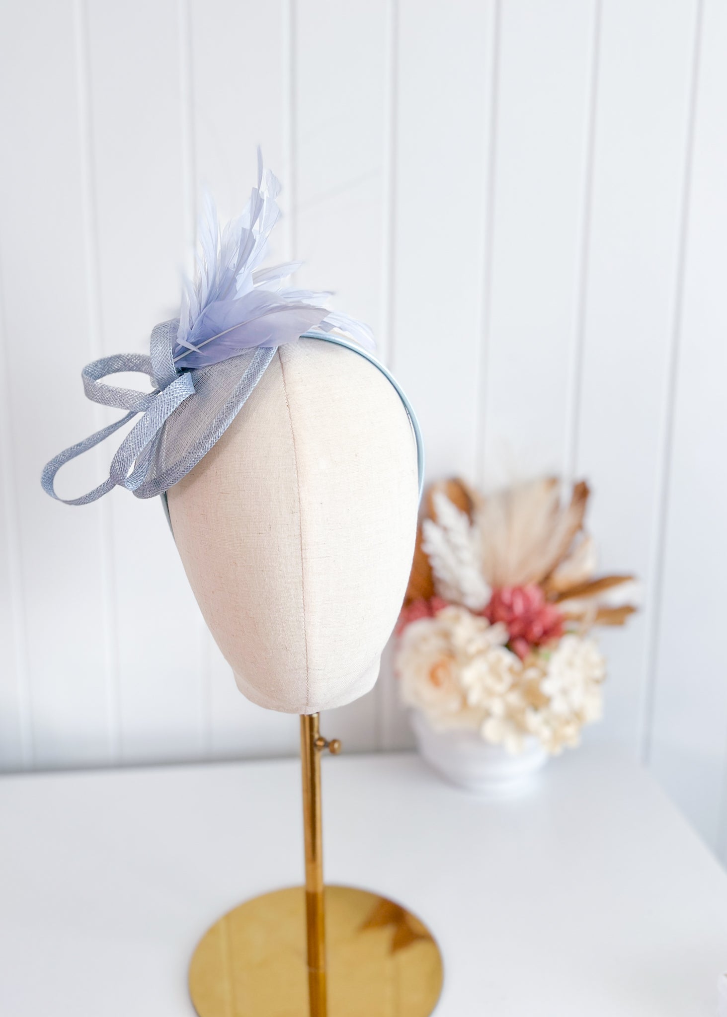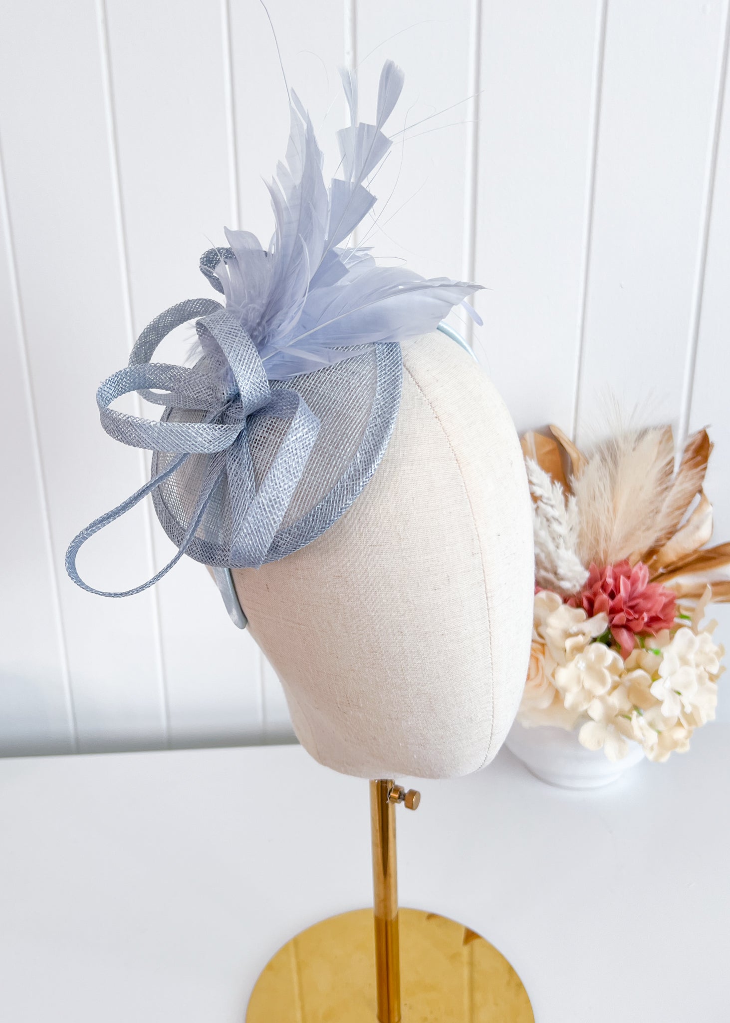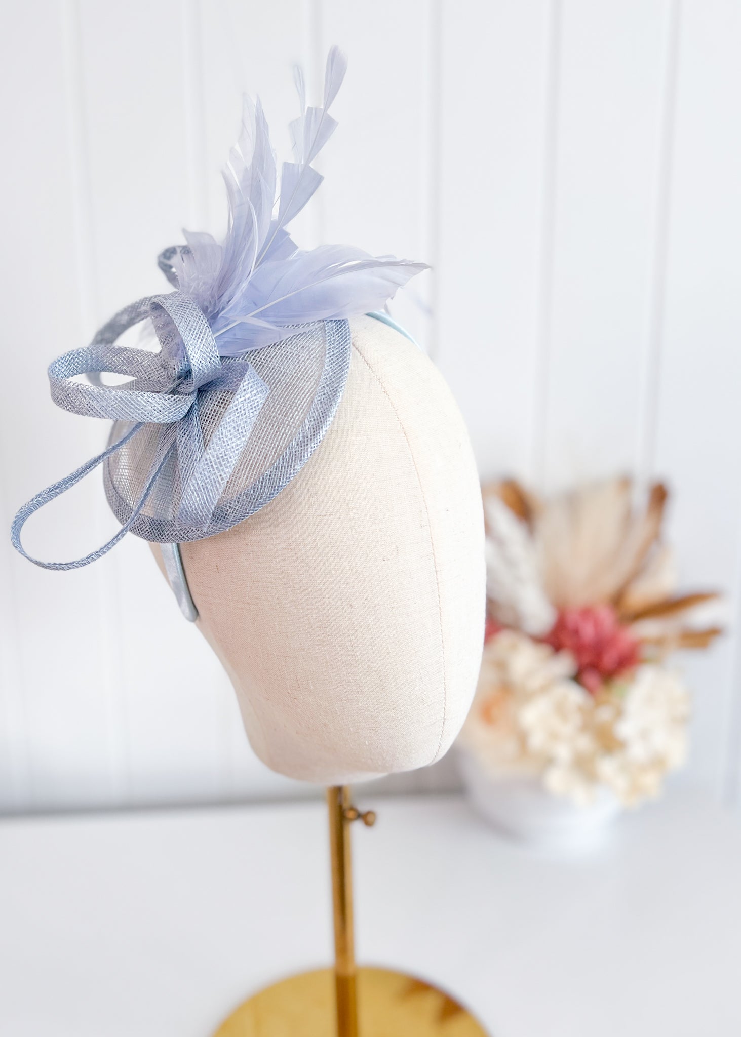 This elegant design features a twisted sinamay base which sits attractively over right side of the head.