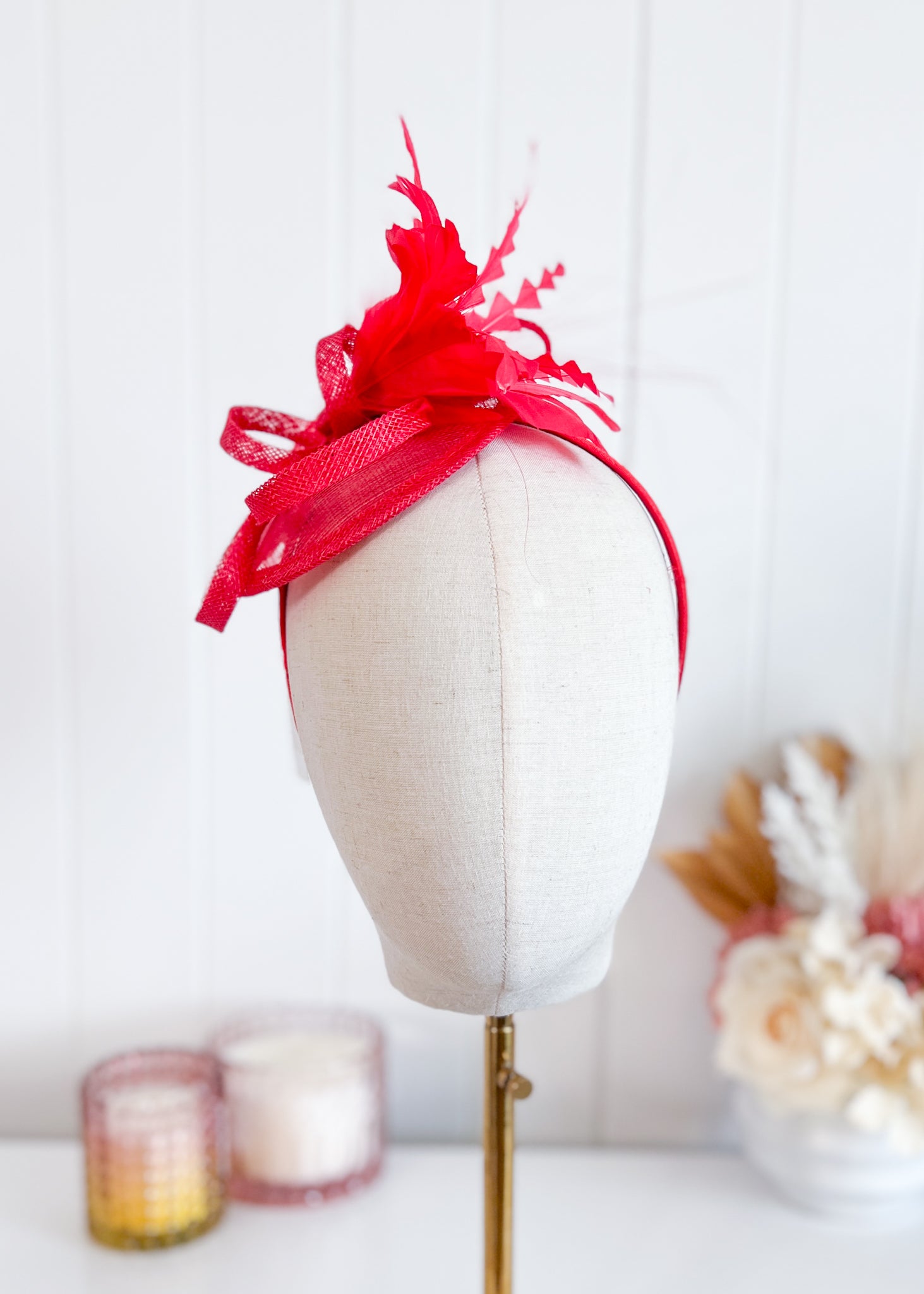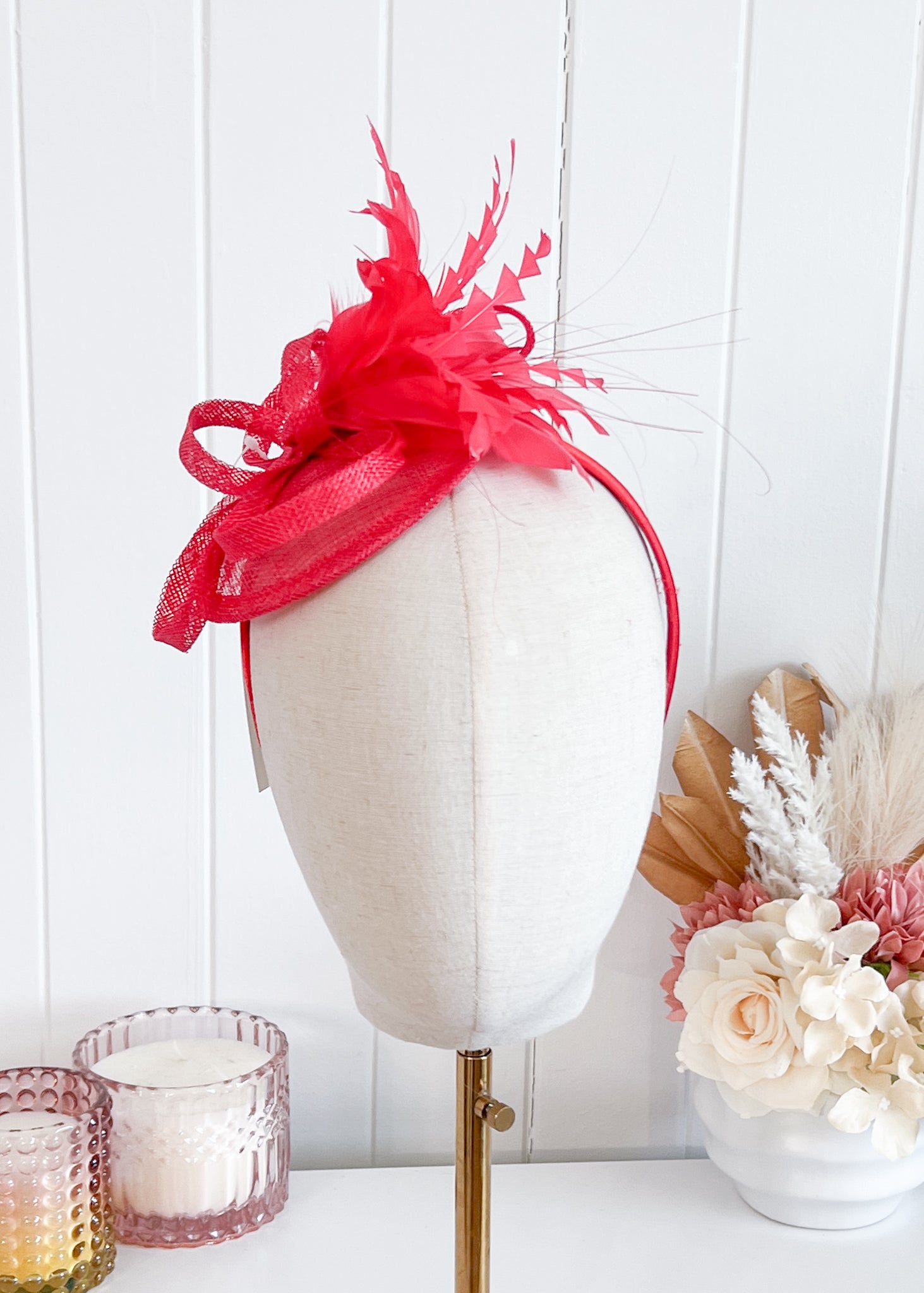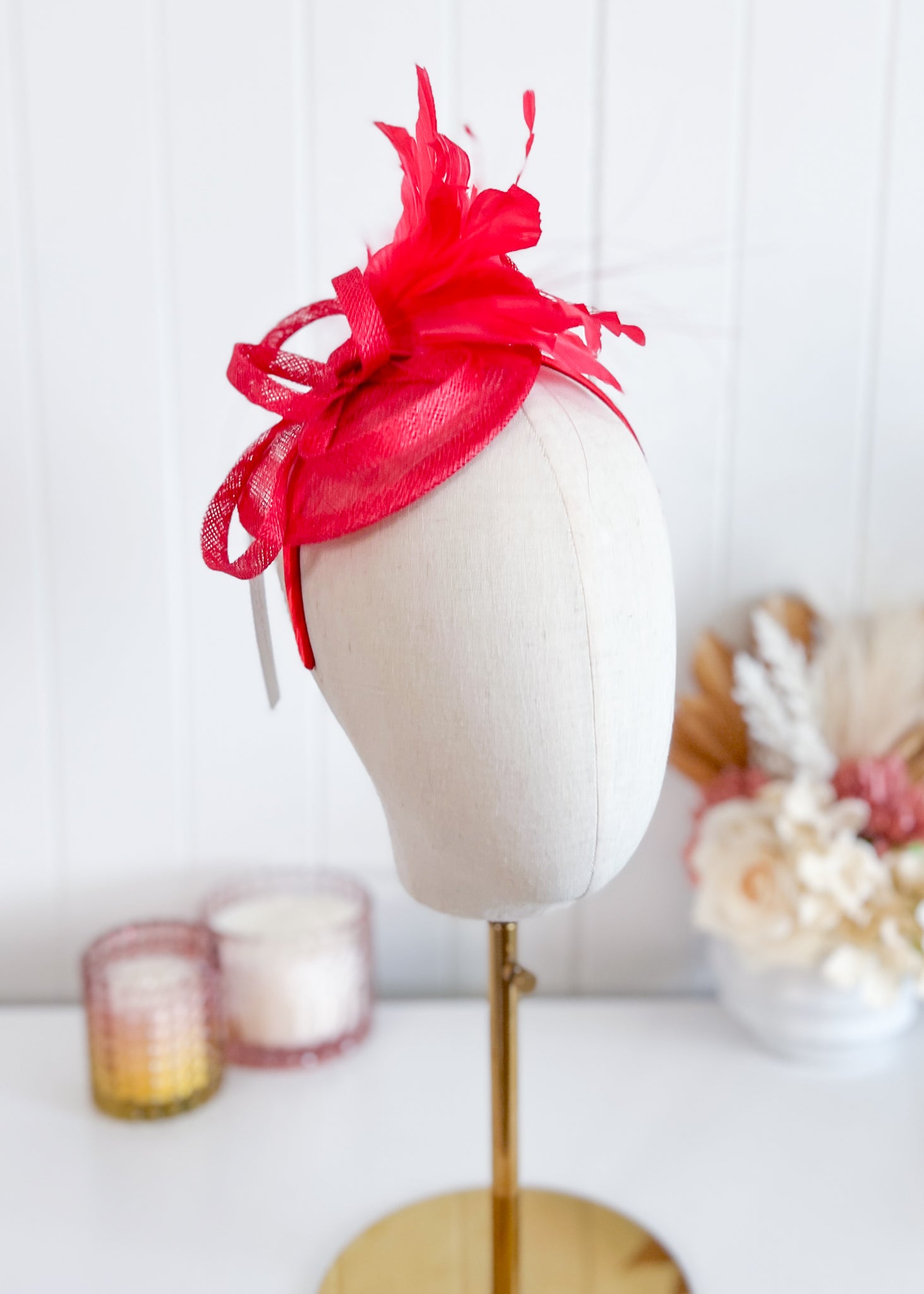 This elegant design features a twisted sinamay base which sits attractively over right side of the head.