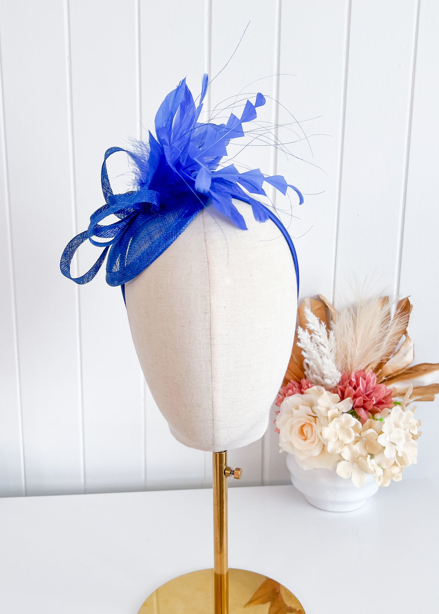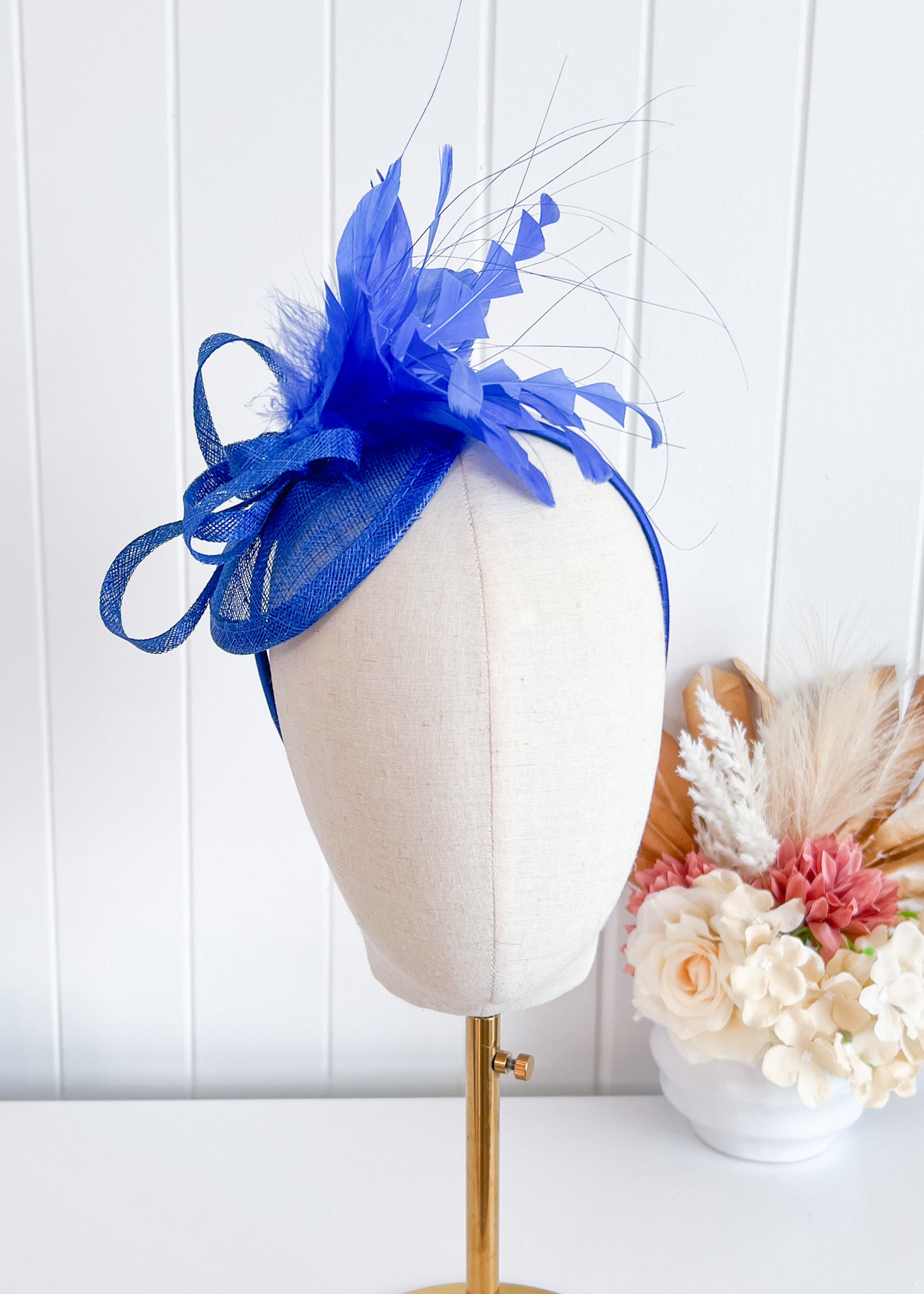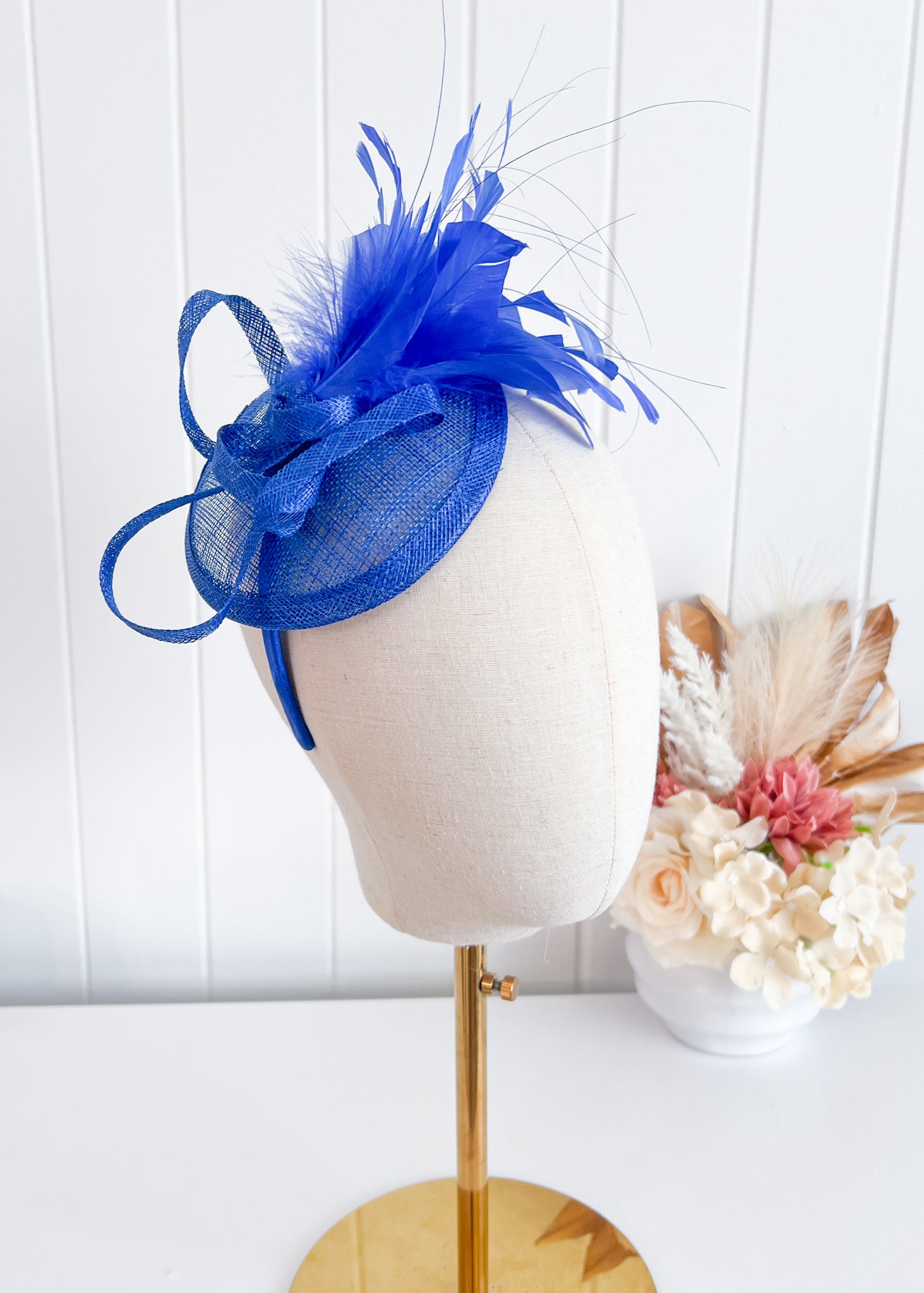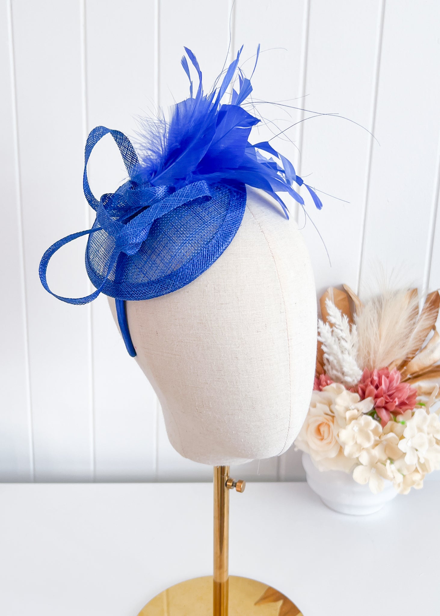 This elegant design features a twisted sinamay base which sits attractively over right side of the head.
