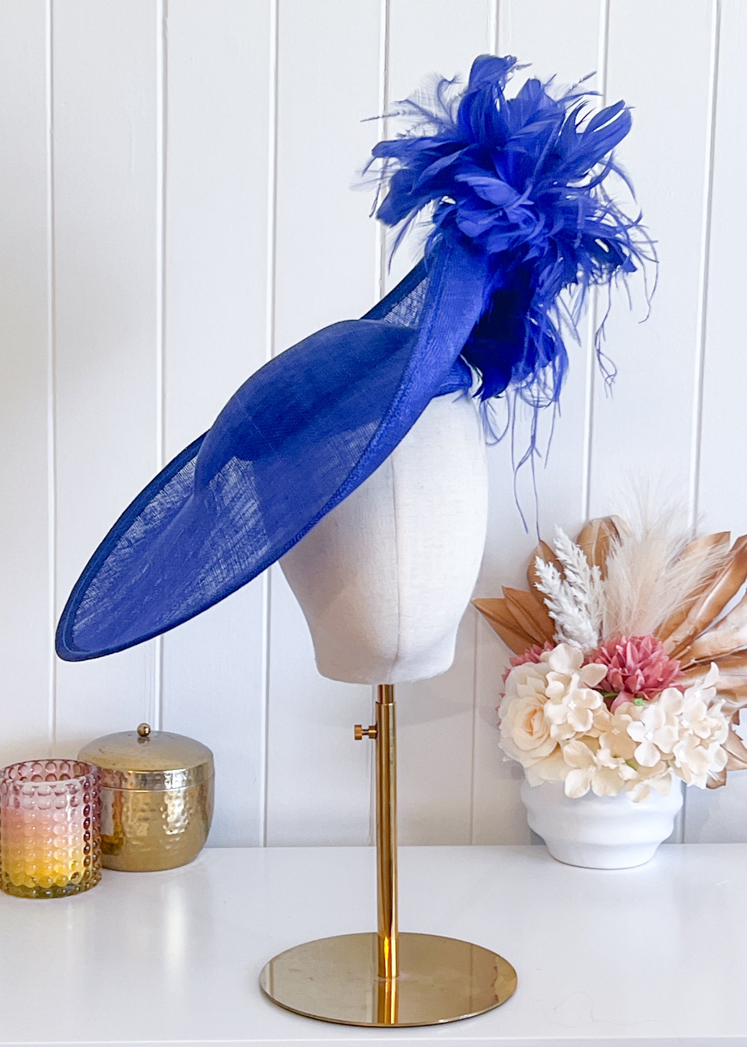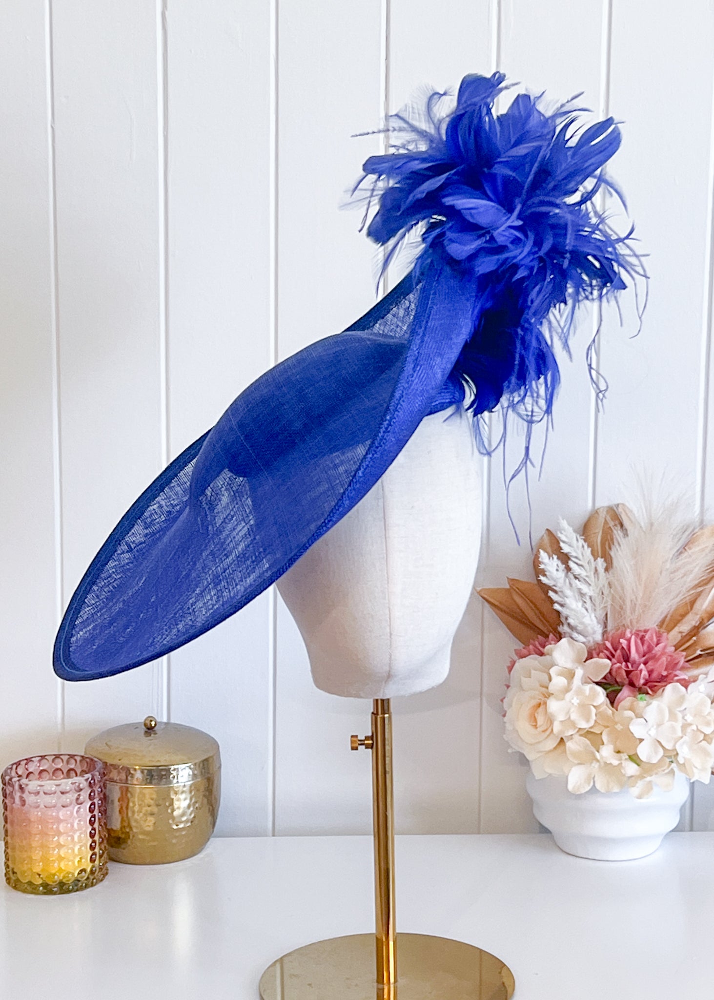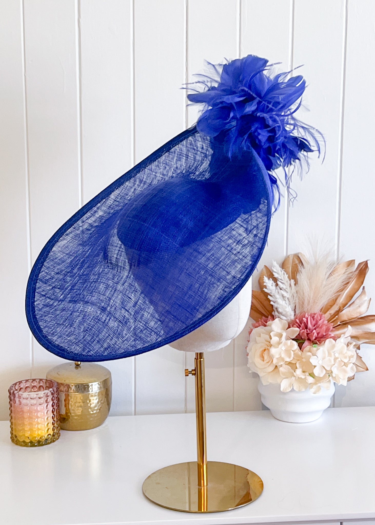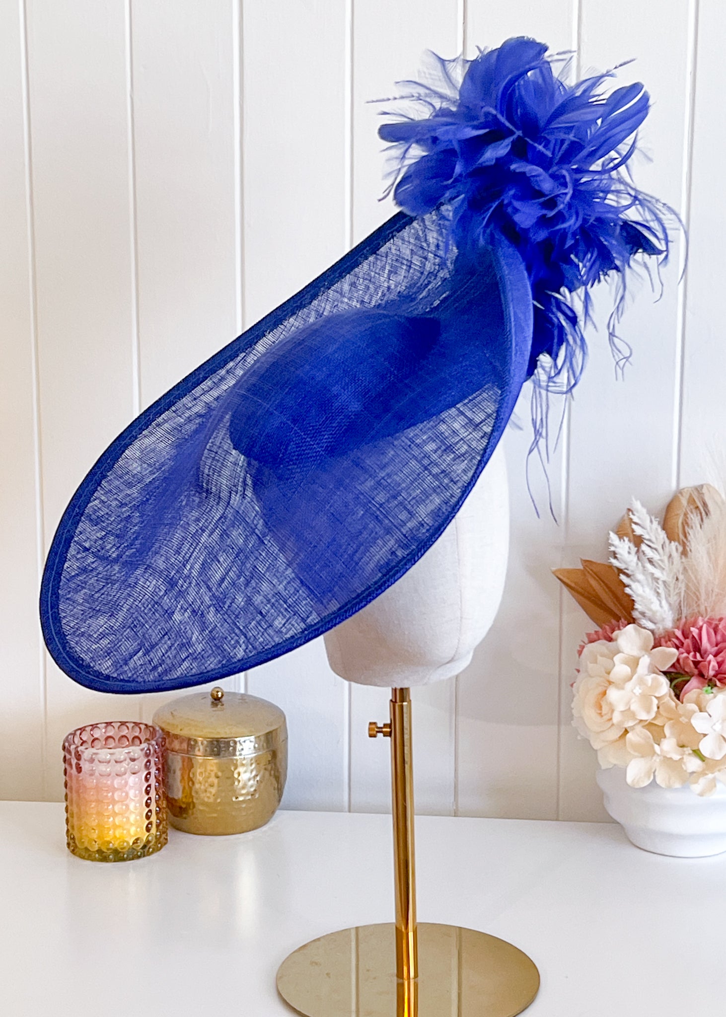 This headpiece features a large sloping sinamay brim, which tilts attractively to one side.