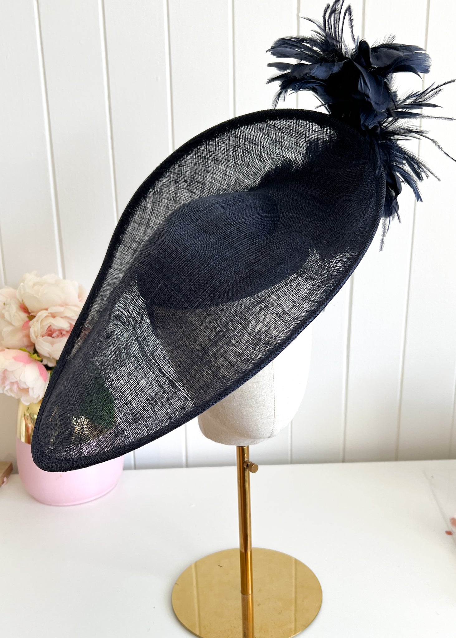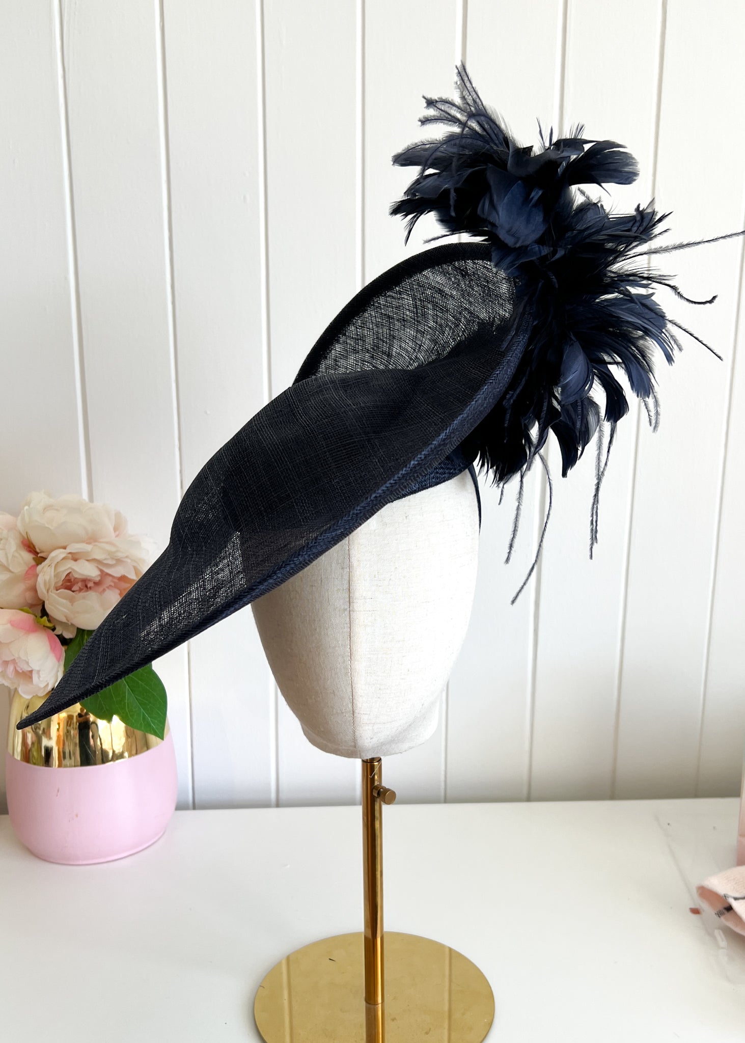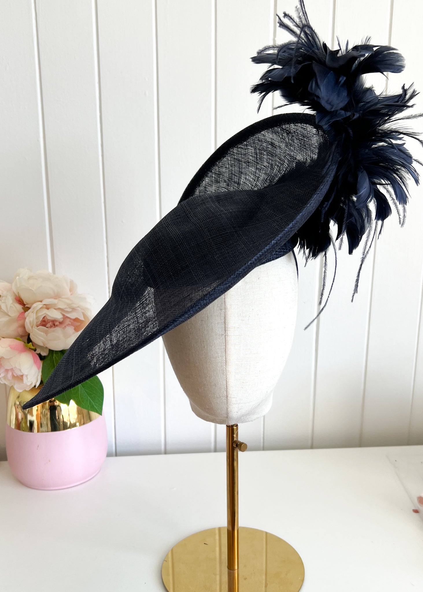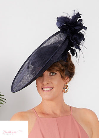 This headpiece features a large sloping sinamay brim, which tilts attractively to one side.