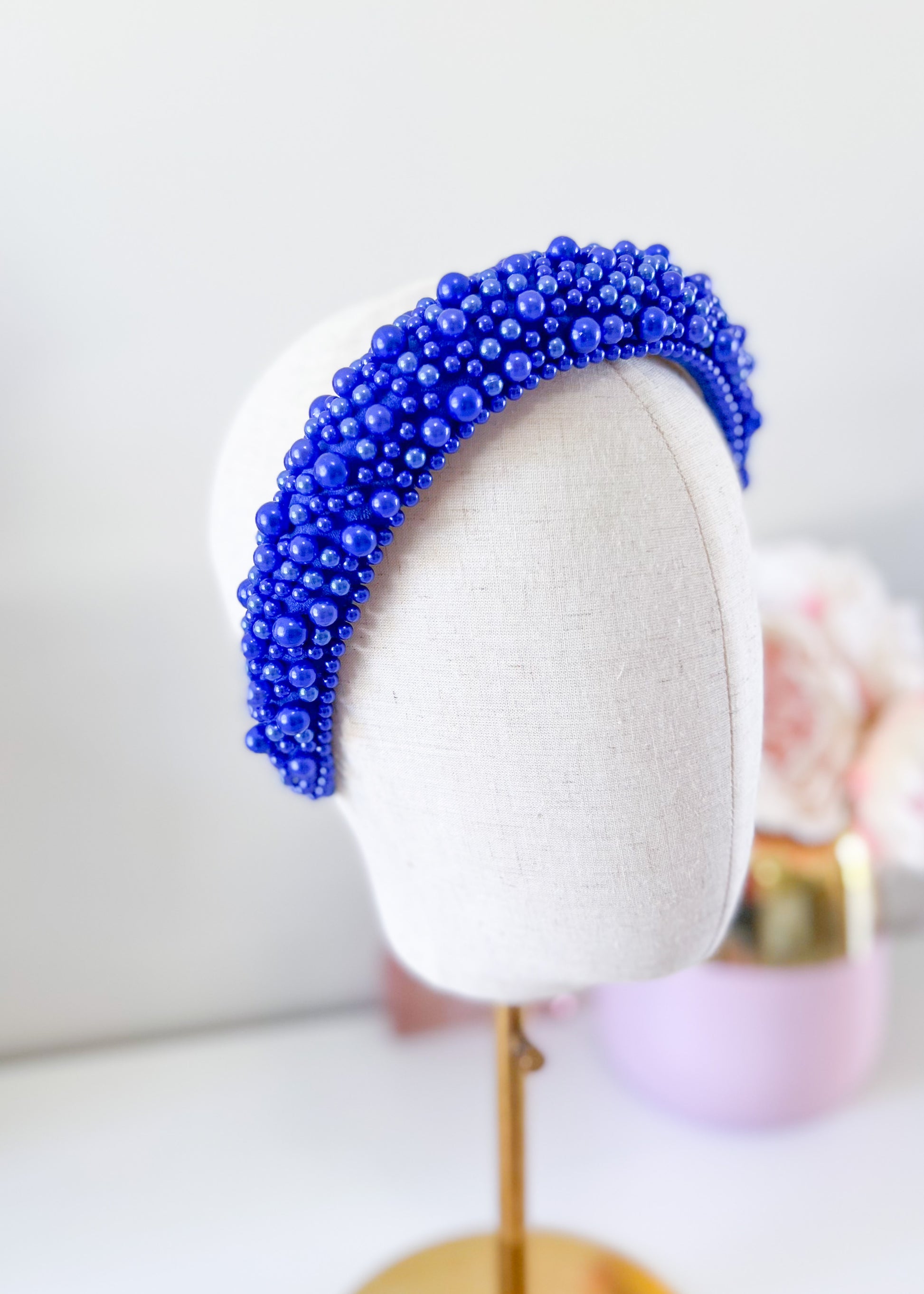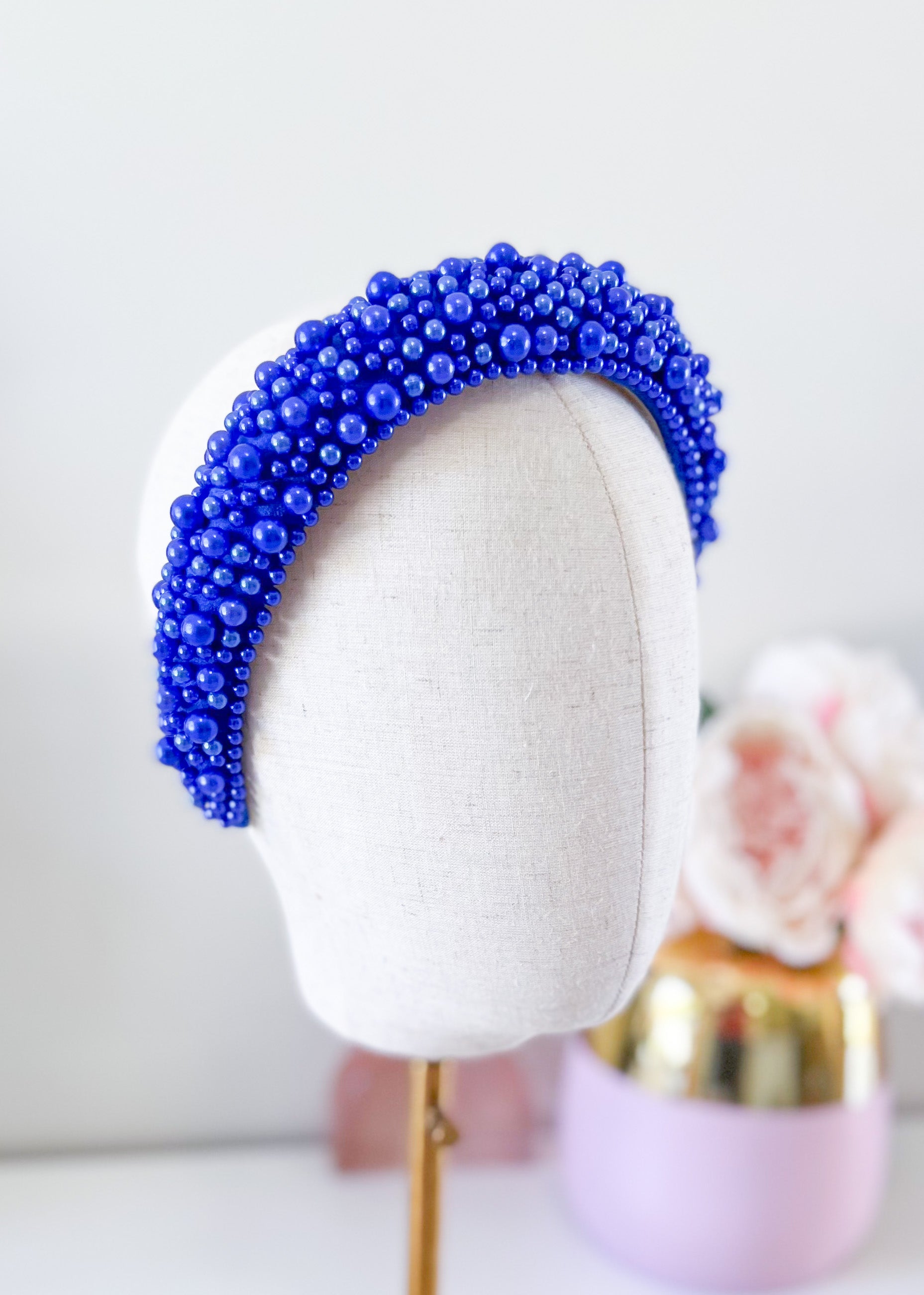 An amazing statement headband. Oversized pearl beads arc across the headband.