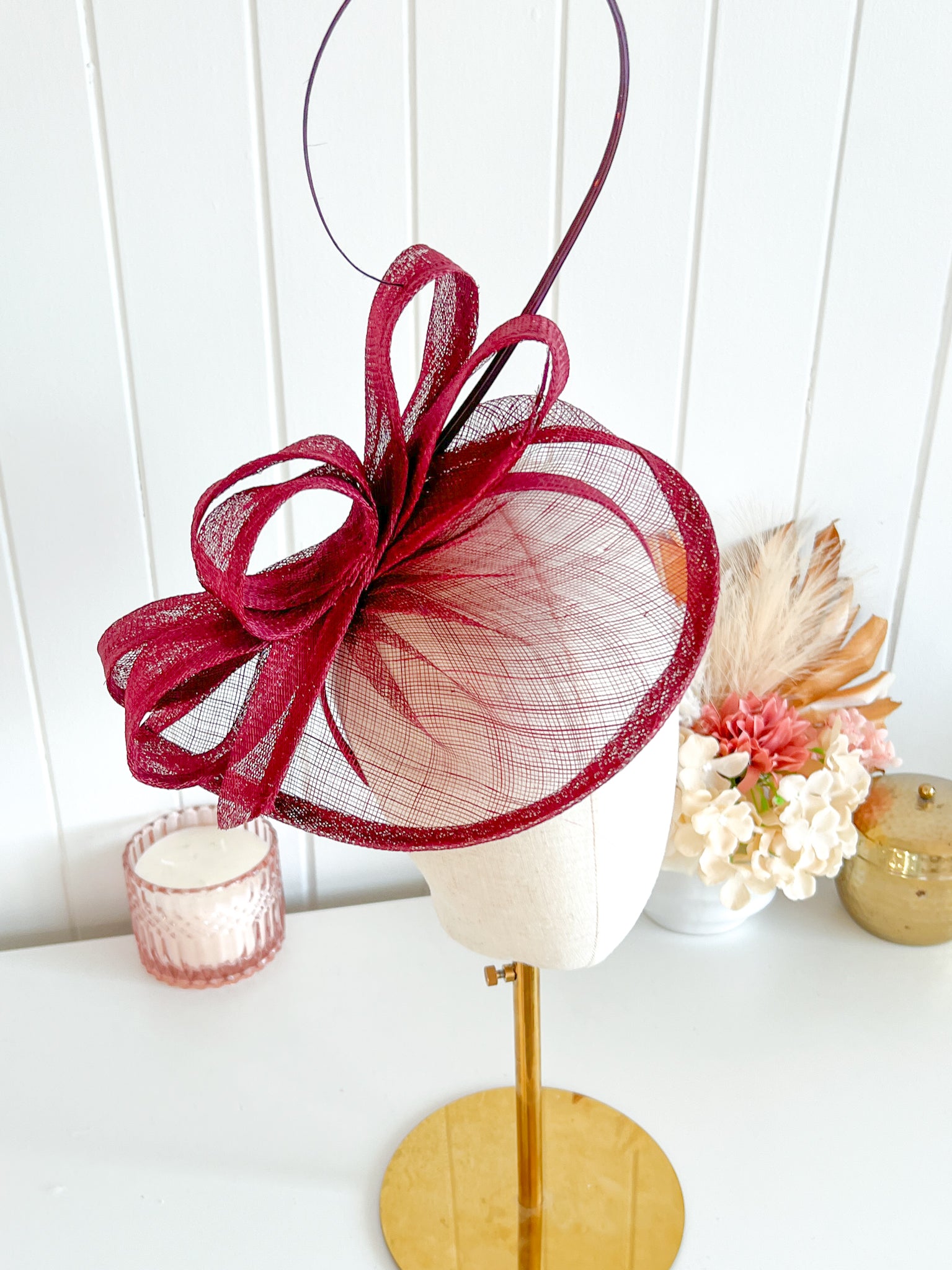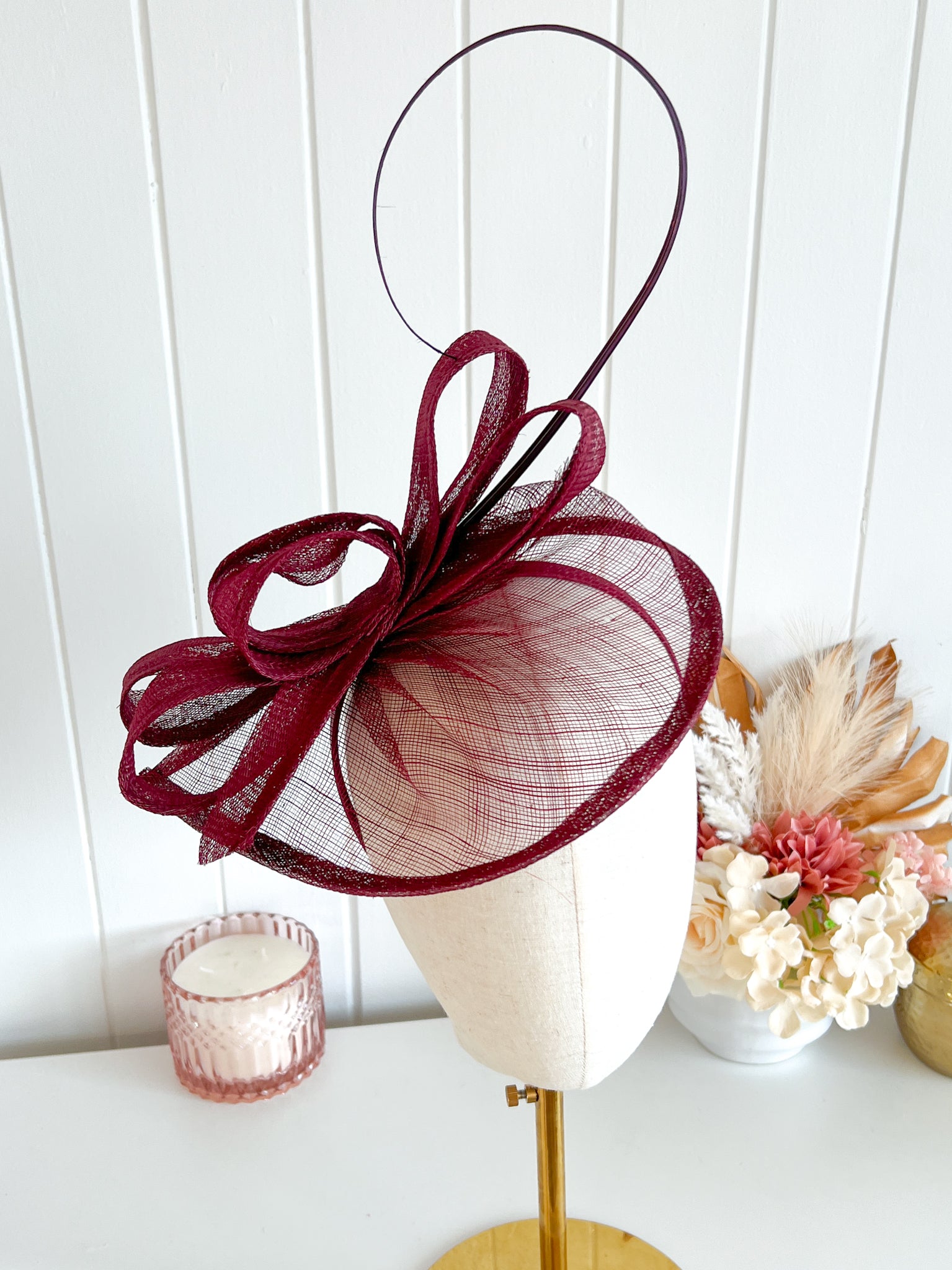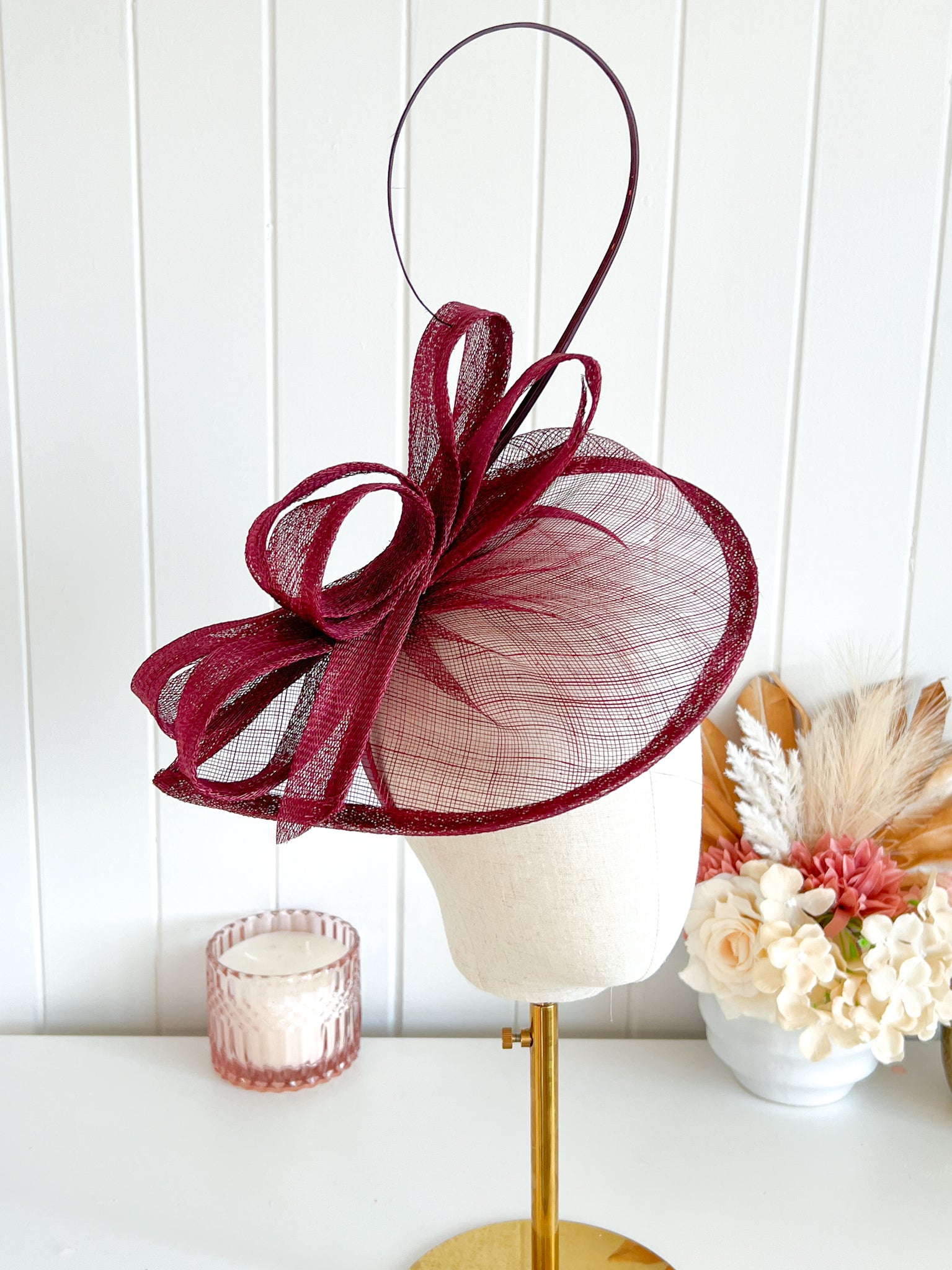 Featuring sinamay shaped in a small - medium size style that twist from back to front, curving gracefully along the side of the head.
