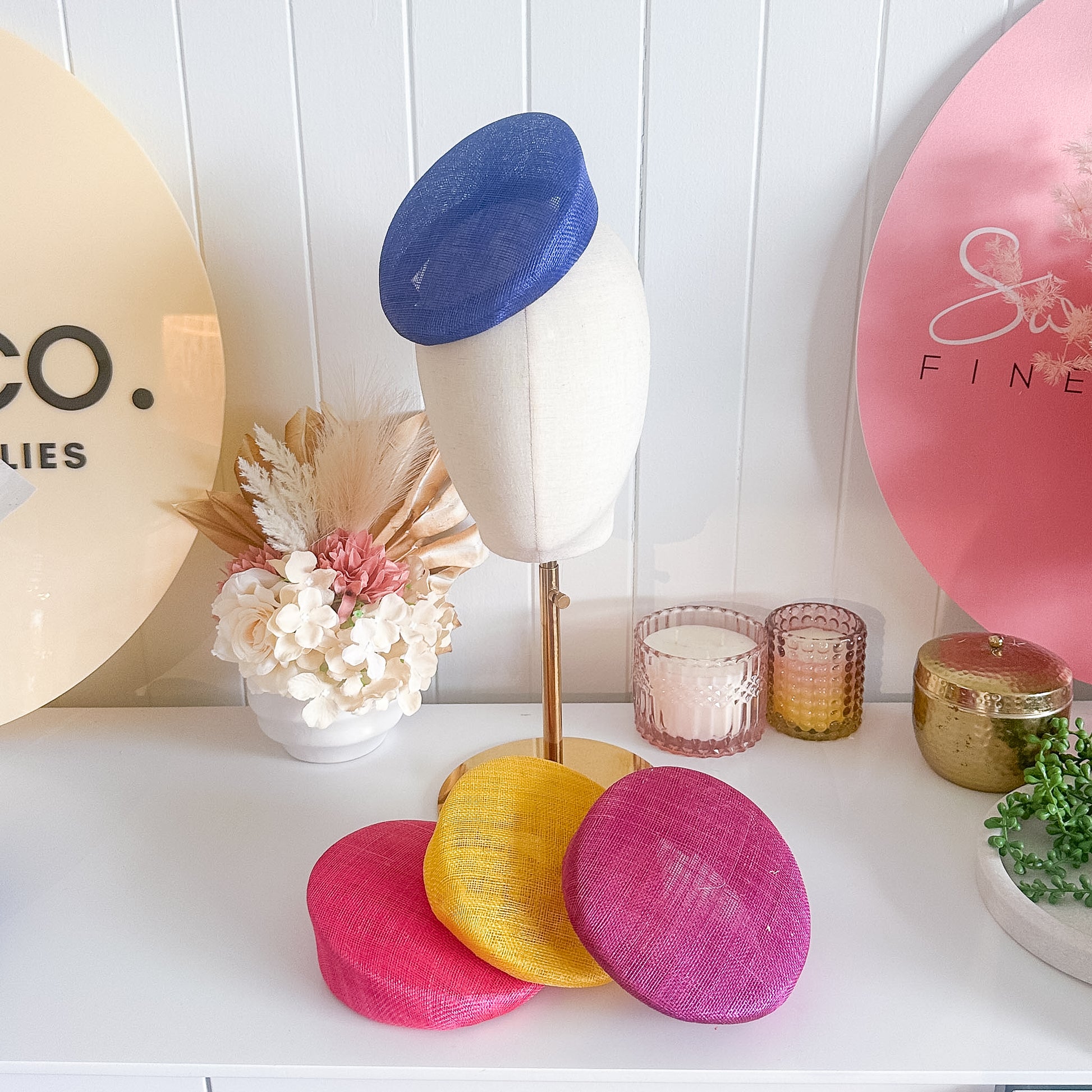 This sinamay hat base is blocked into a sloped style shape. It has a wired edge and is trimmed with ribbon. There are no fasteners attached.