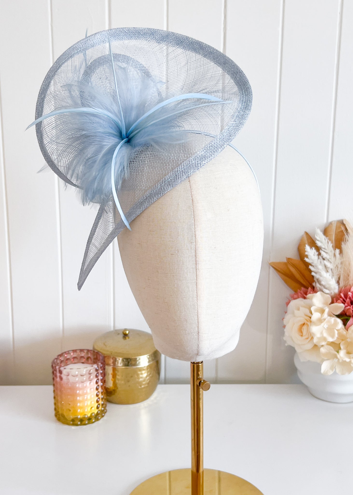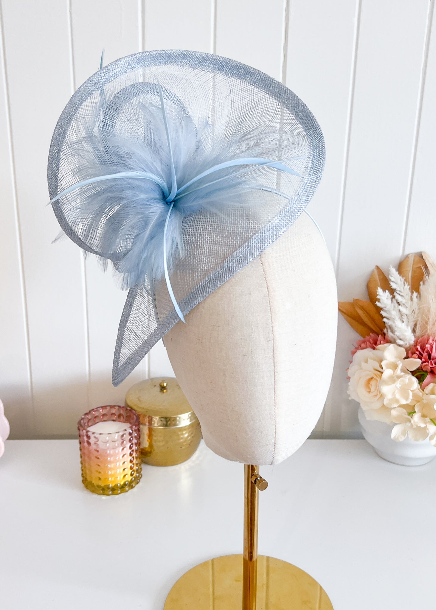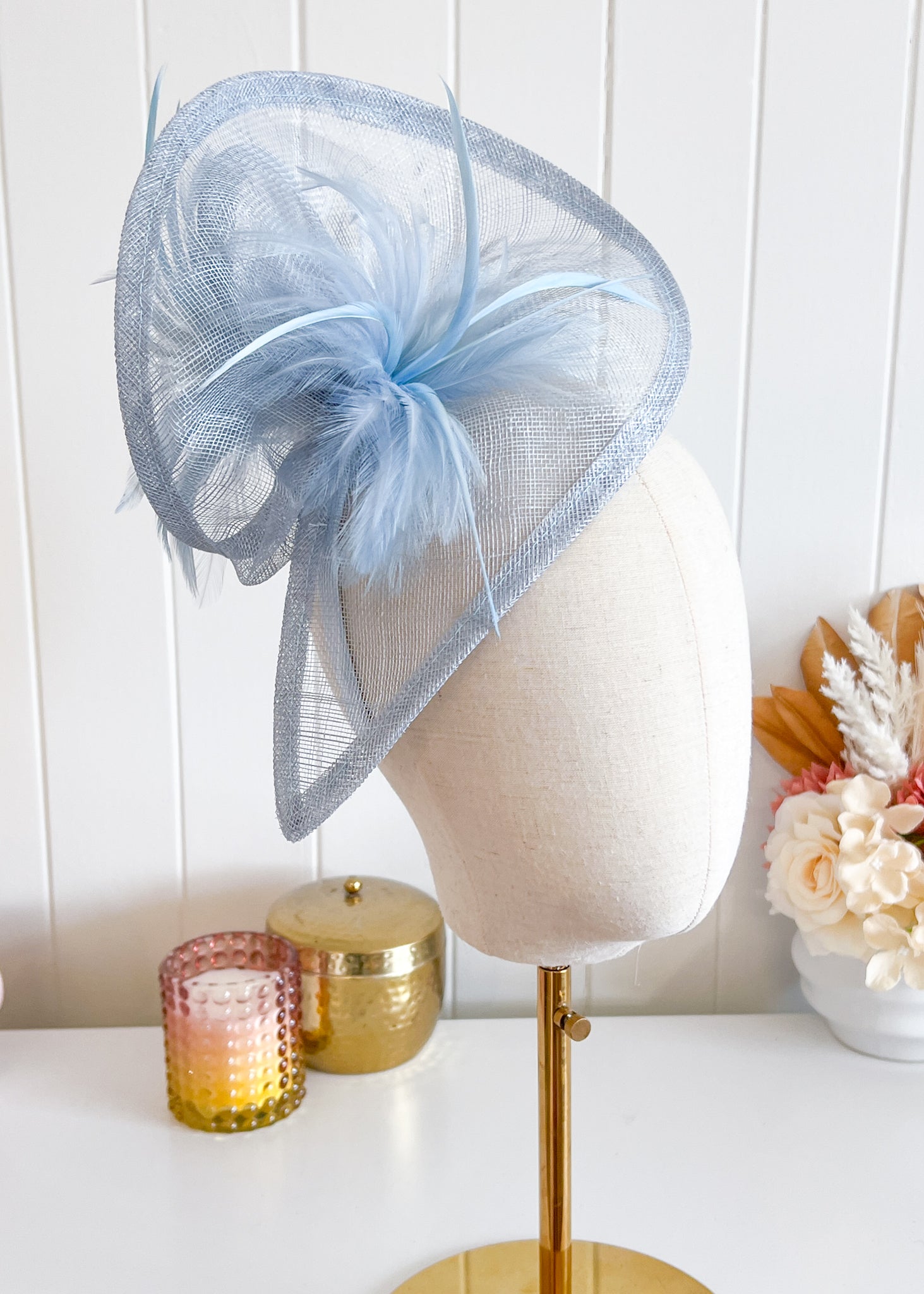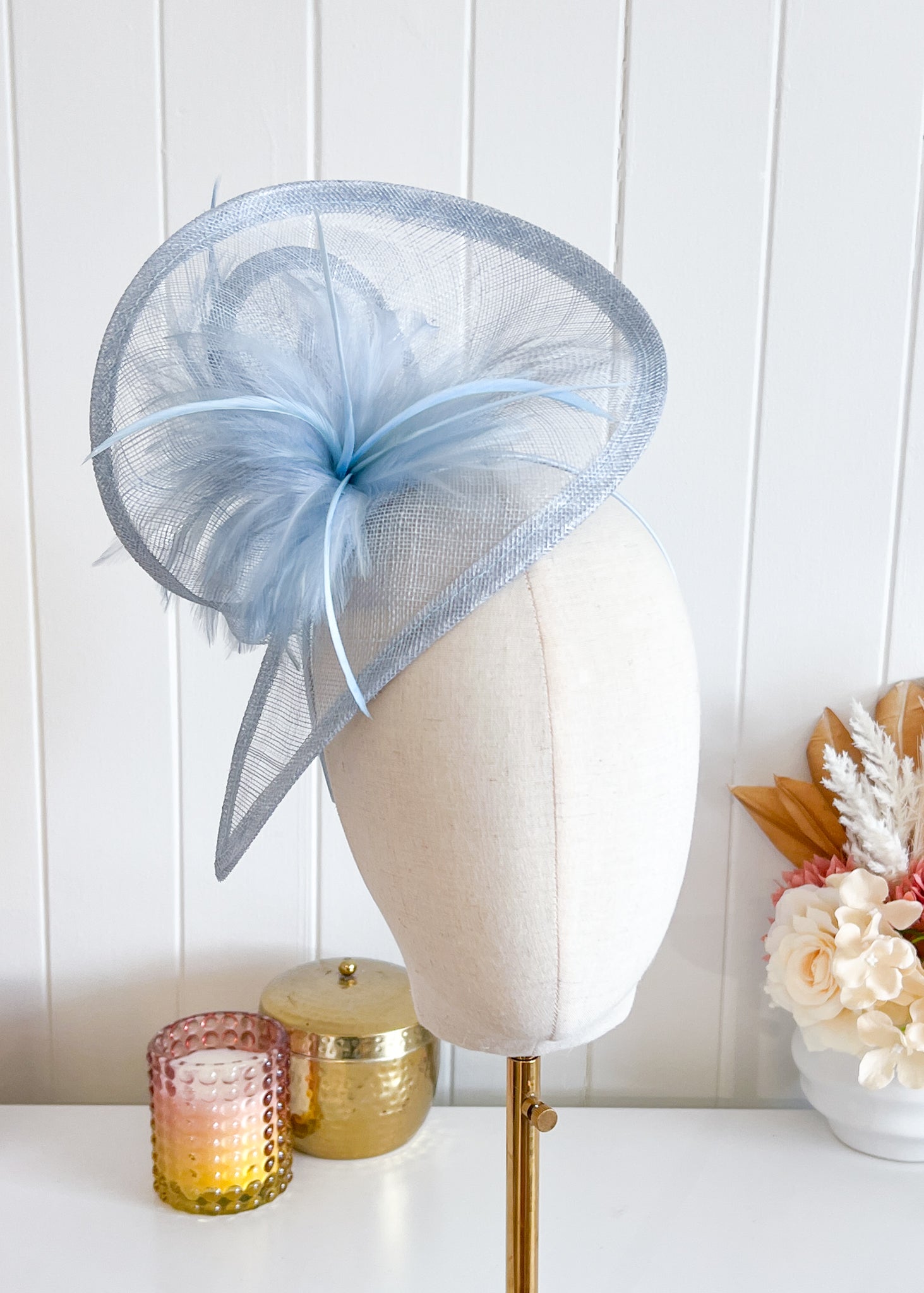 This elegant design features a twisted sinamay base which sits attractively over right side of the head. Soft feathers at the front and back add texture.